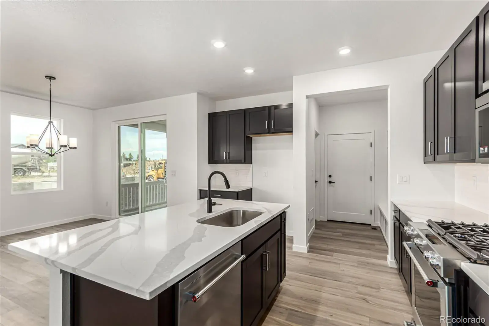 Your dream home is within reach! This stunning 3-bedroom residence welcomes you with a fenced front yard and a front porch that sets an inviting atmosphere. You’ll be delighted by the captivating open layout with high ceilings, a soothing palette, and attractive flooring for a timeless appeal. The kitchen comes with quartz counters, shaker cabinets, ample lighting, a tile backsplash, sleek stainless-steel appliances, a pantry, and a center island with a breakfast bar. You’ll also find a mud room for shoes and coats, and a versatile den ideal for an office or a quiet study. The serene primary bedroom showcases soft carpeting, an ensuite with double vanities, and a practical walk-in closet for an organized wardrobe. Discover an unfinished basement, providing an opportunity to customize to fit your lifestyle needs. Imagine tranquil moments on the covered patio, perfect for enjoying a good book or a warm beverage. Don’t miss out on this gem!
