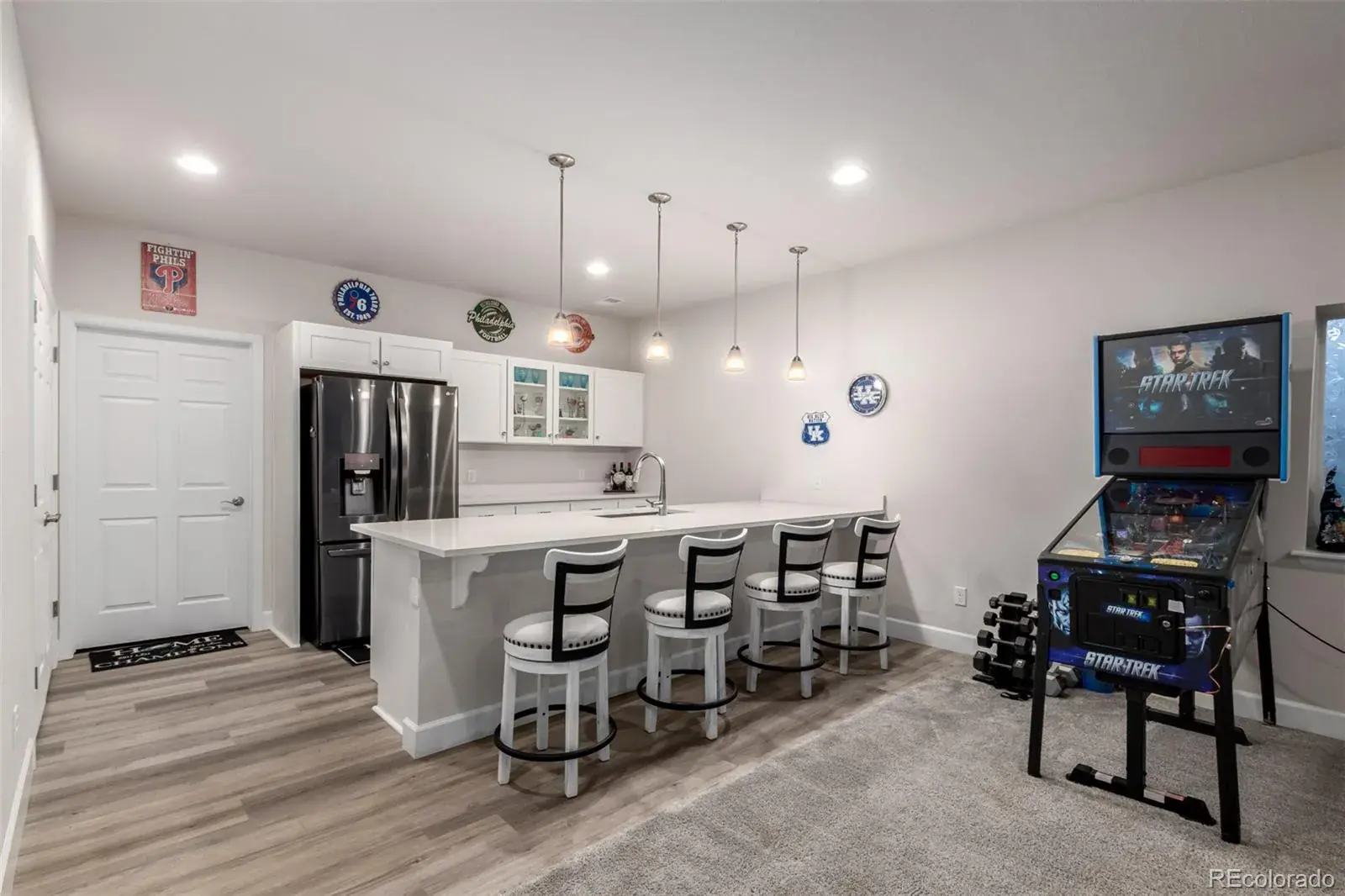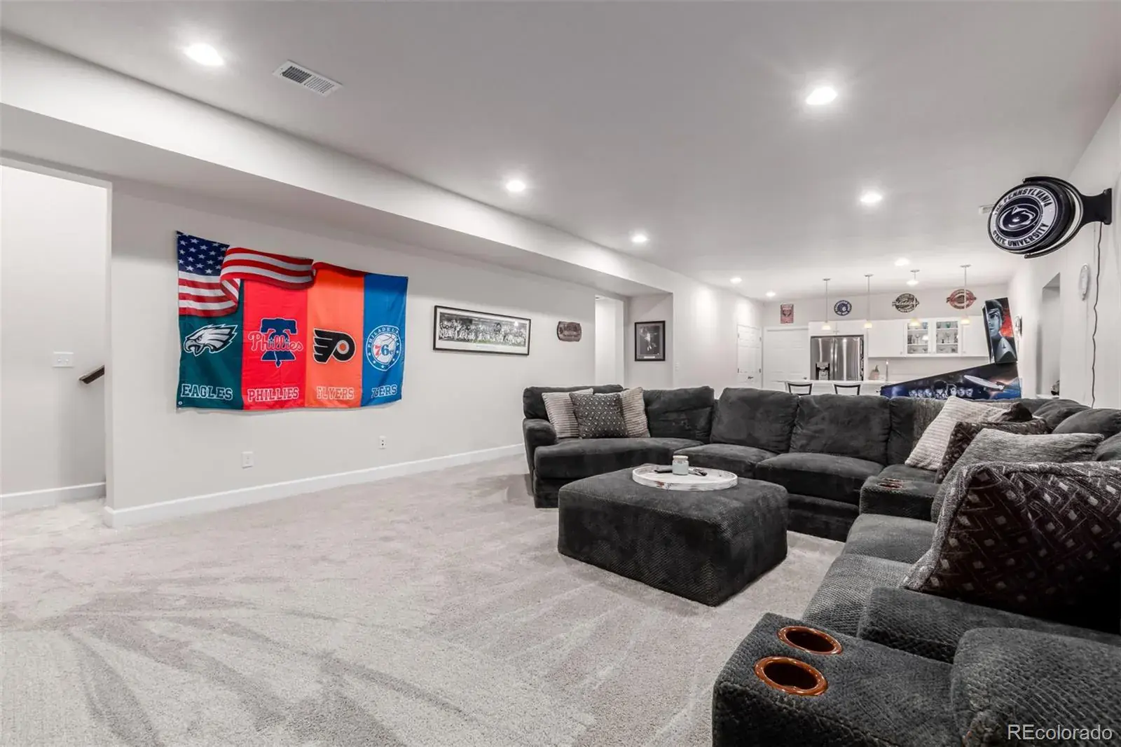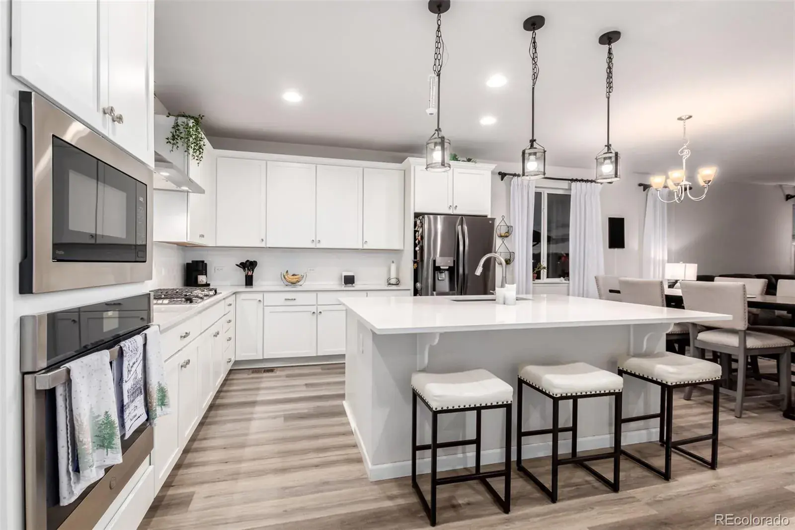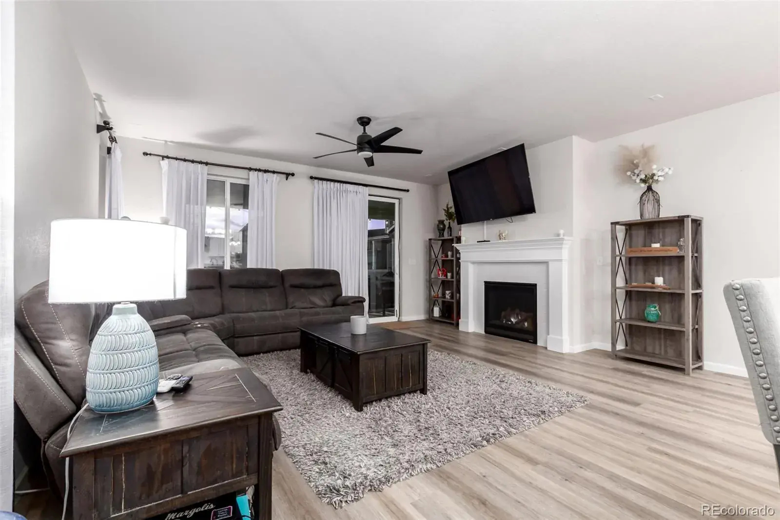 Beautiful ranch-style home designed for entertaining, featuring an open floor plan with a stunning quartz island that flows seamlessly into the spacious family room with cozy fireplace and access to a rare, oversized covered patio showcasing mountain views and unforgettable Colorado sunsets. The main level offers a private primary suite with walk-in shower and walk-in closet, two additional bedrooms, convenient main-floor laundry, and custom drapes included. The finished basement is built for hosting with an incredible wet bar offering abundant cabinet space, perfect for game days or poker nights, plus two large bedrooms and a 3/4 bath. Enjoy quiet cul-de-sac living within walking distance to coffee shops, a Super Walmart, restaurants and everyday conveniences.