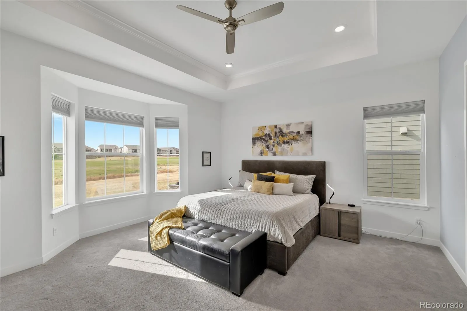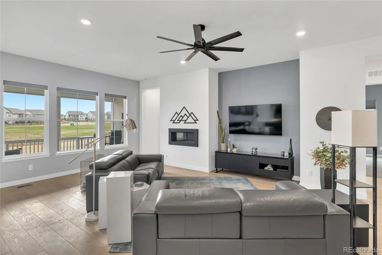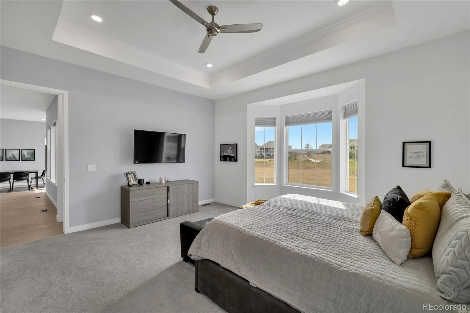AMAZING VIEWS!, this home will leave you amazed and wanting more! Sitting on the 6th Tee Box with stunning course views, this 3 bedroom, 3 bath home has 2,117 SF on the main level plus an additional 2,117 SF of beautifully finished basement living area. Wide plank luxury vinyl floors & carpet, and tile run throughout the living areas of the main level. The kitchen has beautiful quartz countertops with a large island, pantry, gas cooktop, and stylish double ovens. There is a dining area just off the kitchen and both are open to a wonderful family room. With 12′ ceilings, lots of windows and great light, and golf course views it is the perfect area for entertaining. The Primary Suite has a bay window and a high tray ceiling and features a Primary Bath accented by a custom glass shower door, large tiled shower and duel vanities. A large en suite bedroom features a full bath and large closest, perfect for out of town visitors; while a 3rd bedroom can double as an office or den. The family room, kitchen, and Primary Bedroom all have stunning fairway views! Need more space? The basement is magnificently finished with a large family area, 3 large rooms, and a nicely finished gym. Back on the main level walk out the back sliding door onto a large deck with a sprawling extended patio, plenty of room, back deck blinds that create the perfect outdoor living! This 55+ neighborhood is the ideal community for active adults offering an abundance of clubs, 2 pools (inside & outside), tennis and pickleball courts, and a wonderful restaurant and bar that offers a great place to gather with friends for happy hour or dinner. And of course there is fantastic golf course if you enjoy the Links! Come make HTC your new Home!