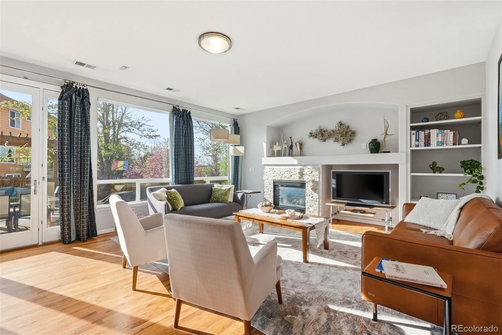 The family room with its fireplace and built-in shelves creates a warm, cozy, and inviting space with large windows that fill the room with afternoon sunlight, giving it a bright, sun-drenched feel.