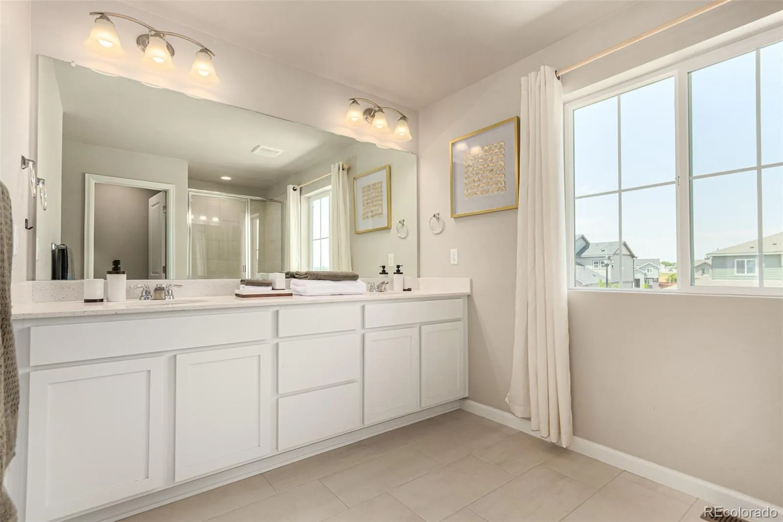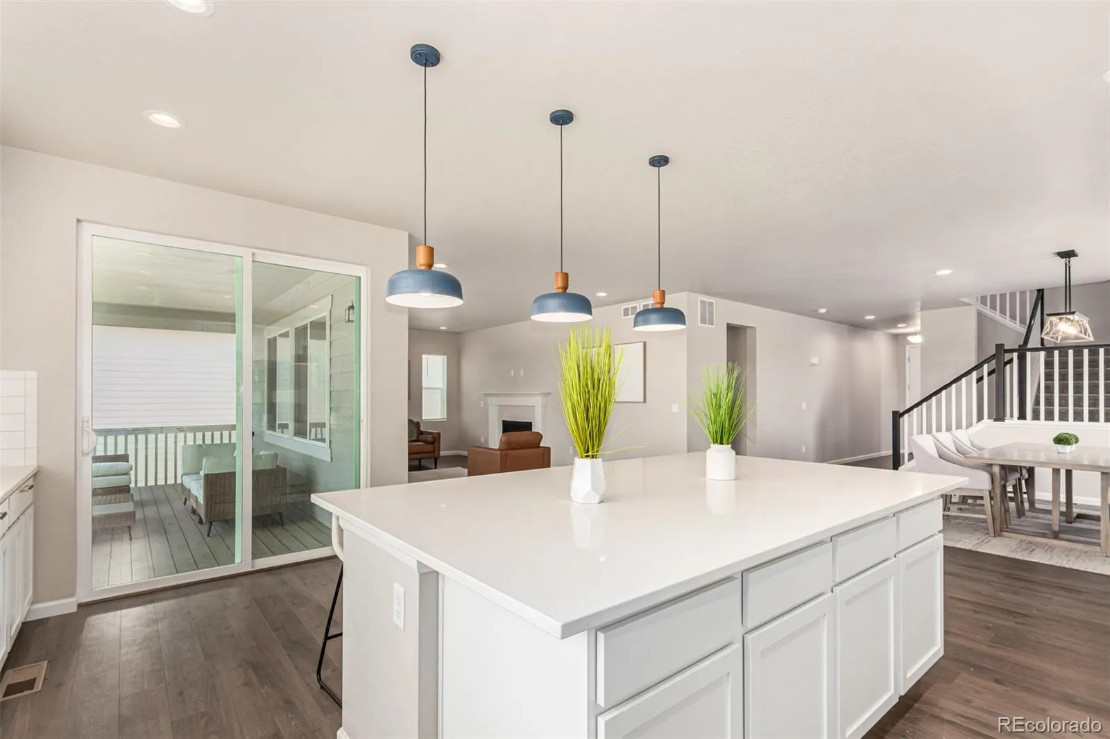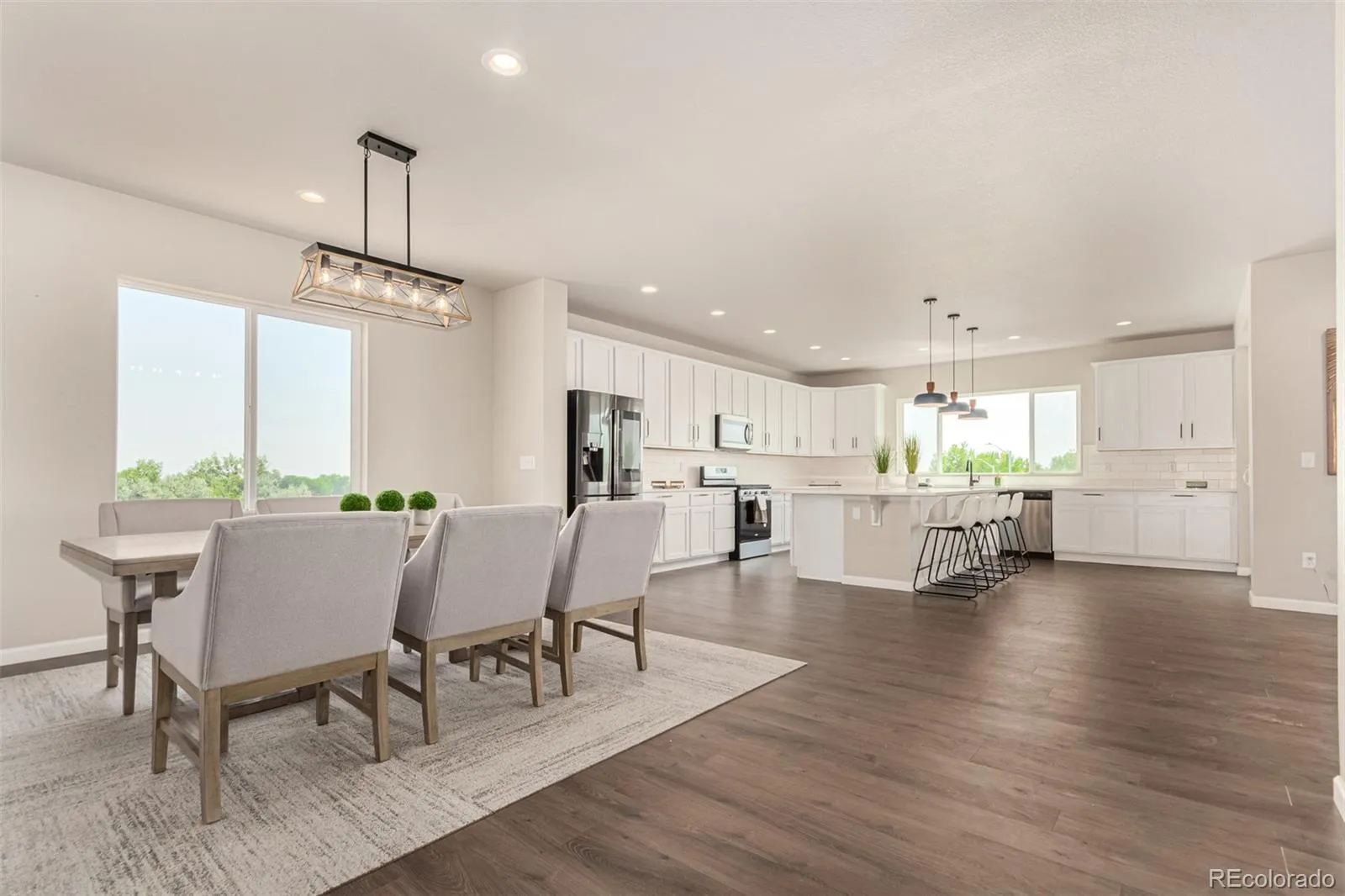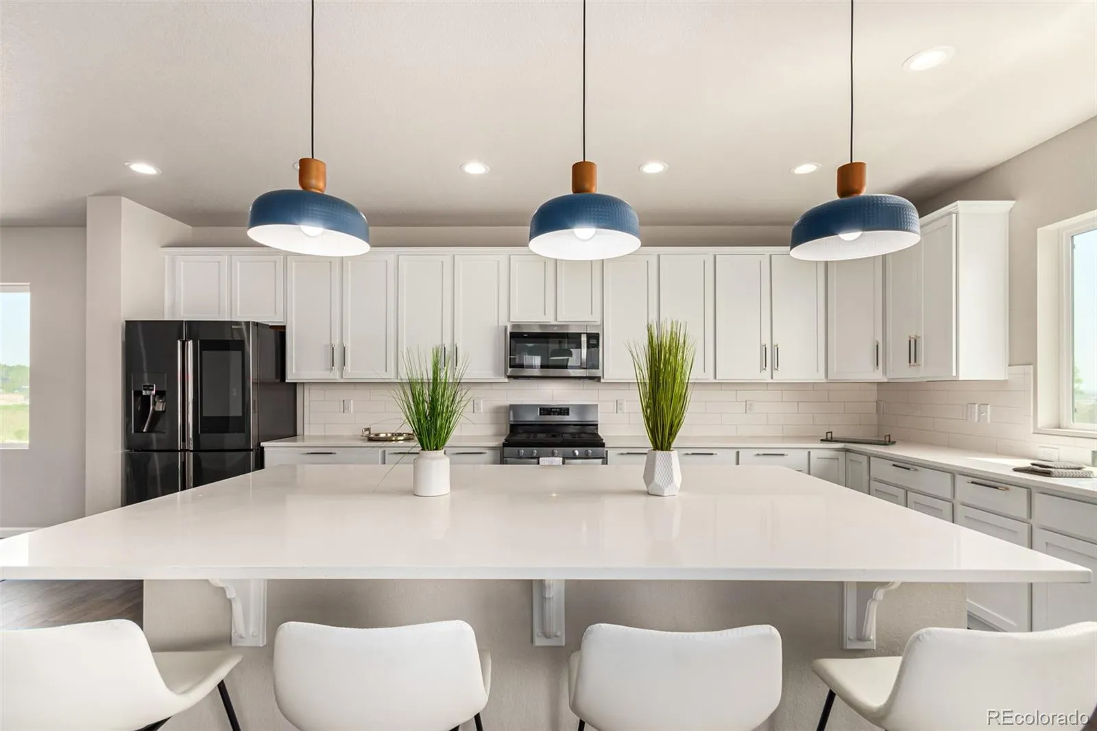 This newly constructed home showcases soaring ceilings and an open-concept floor plan enhanced by designer lighting throughout. Positioned on one of the community’s most desirable lots, this two-story corner home sits in a quiet corner, backing to expansive green space and offering exceptional privacy along with views of Downtown Denver.
