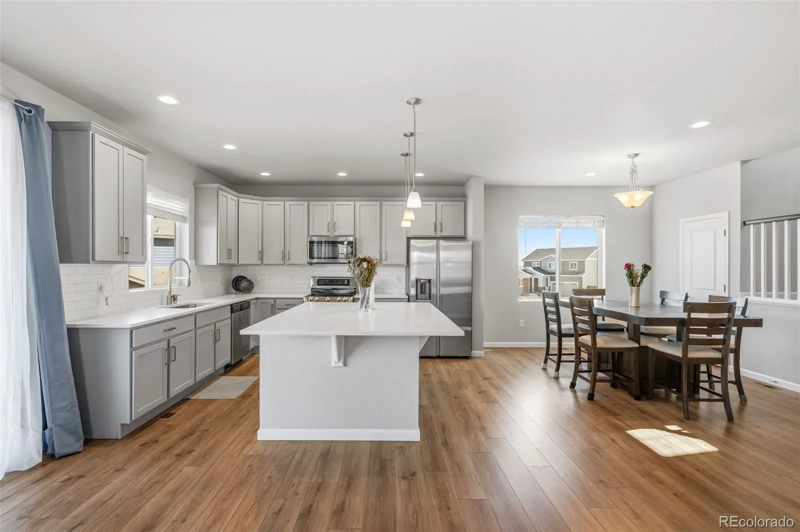 Stunning 4-bedroom, 4-bath home situated on an expansive 10,099 sq ft lot in Thornton! This beautifully upgraded Bronte at Mayfield floorplan offers a versatile two-story layout with abundant space for both everyday living and entertaining. The main level welcomes you with a private study near the entry, a half bath, a spacious dining area, and an open-concept great room anchored by a cozy gas fireplace. The chef’s kitchen is a true showstopper, featuring an oversized island, upgraded cabinetry with crown molding and pulls, quartz countertops, designer backsplash, pendant lighting, a single-bowl undermount sink with pull-out faucet, and a generous walk-in pantry. Durable vinyl plank flooring flows throughout the entire first floor, complemented by recessed lighting in both the great room and study. The roof was replaced in June 2024 with Level 4 high-impact shingles, offering added durability and peace of mind.
