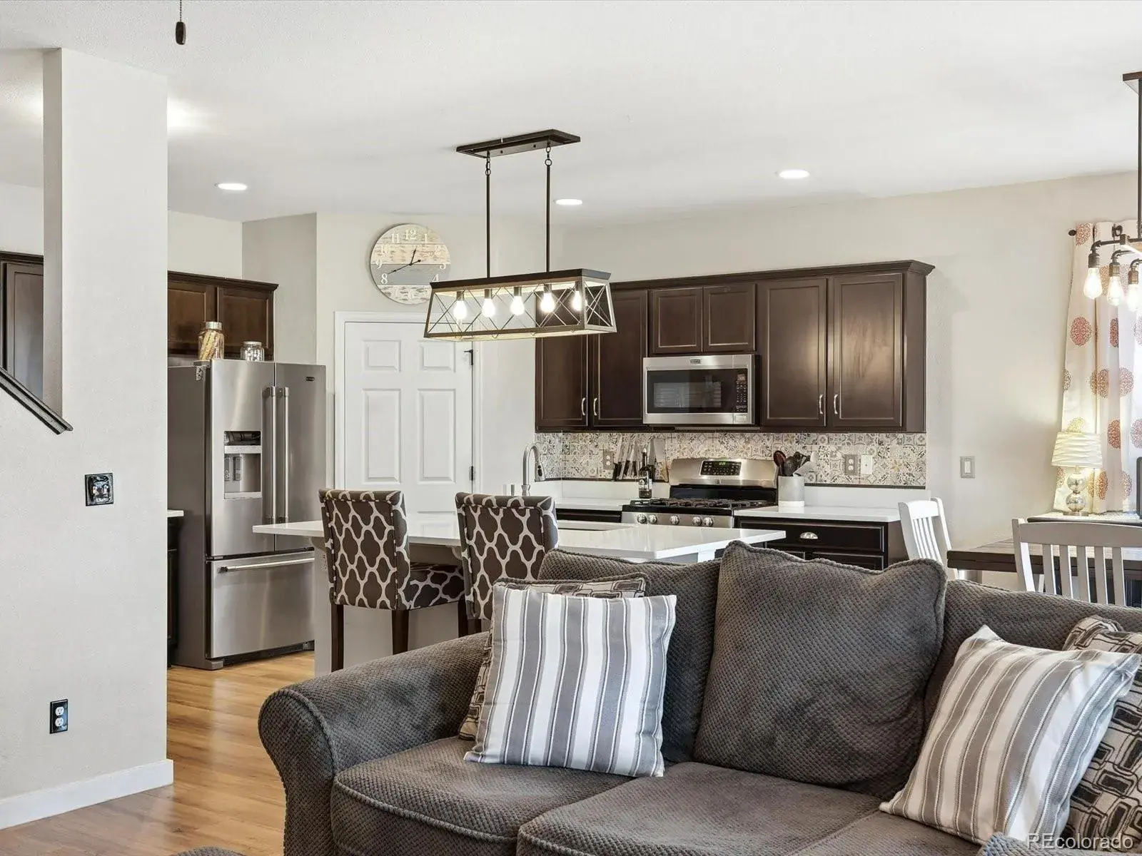 Newer flooring spans the main level, where the kitchen, dining, and living areas connect in an open layout. The kitchen features quartz countertops, stainless steel appliances, a large island, and ample cabinet space. A main-level bedroom and full bathroom offer flexibility for guests or multi-generational living, while a front flex room works well as a home office or formal dining space.