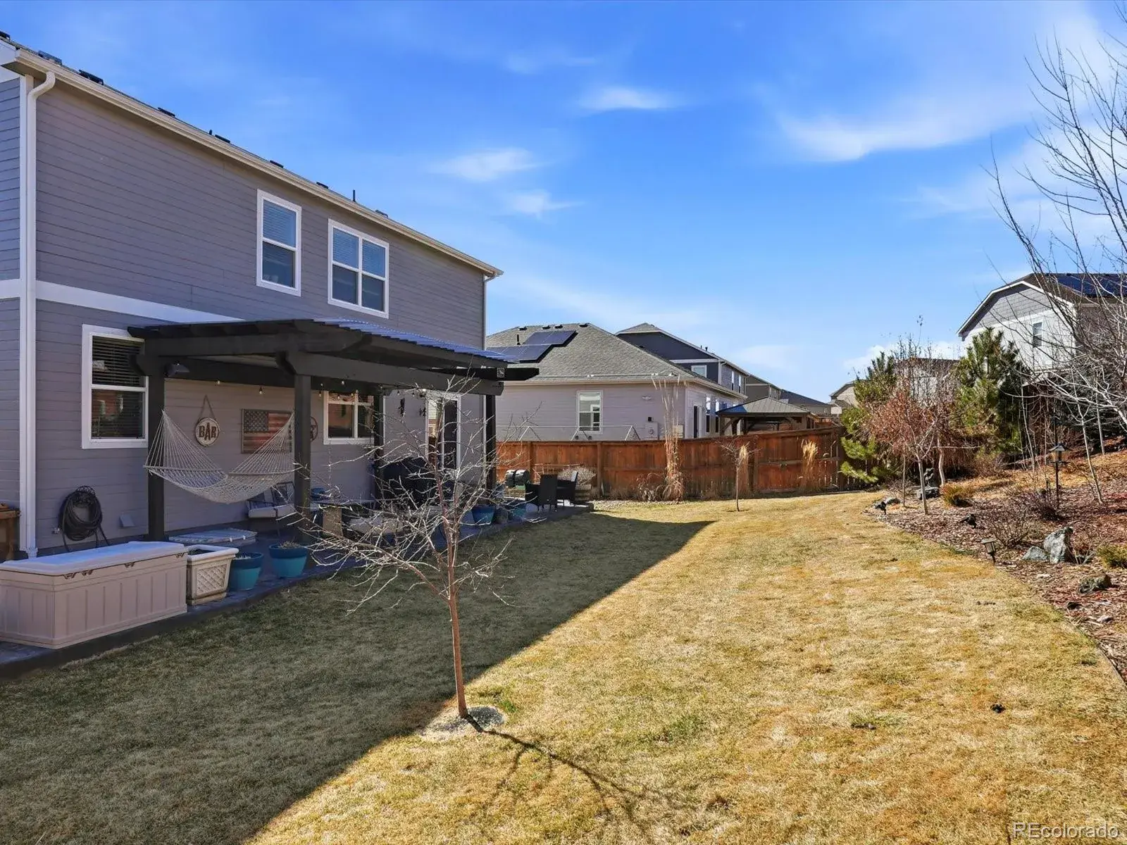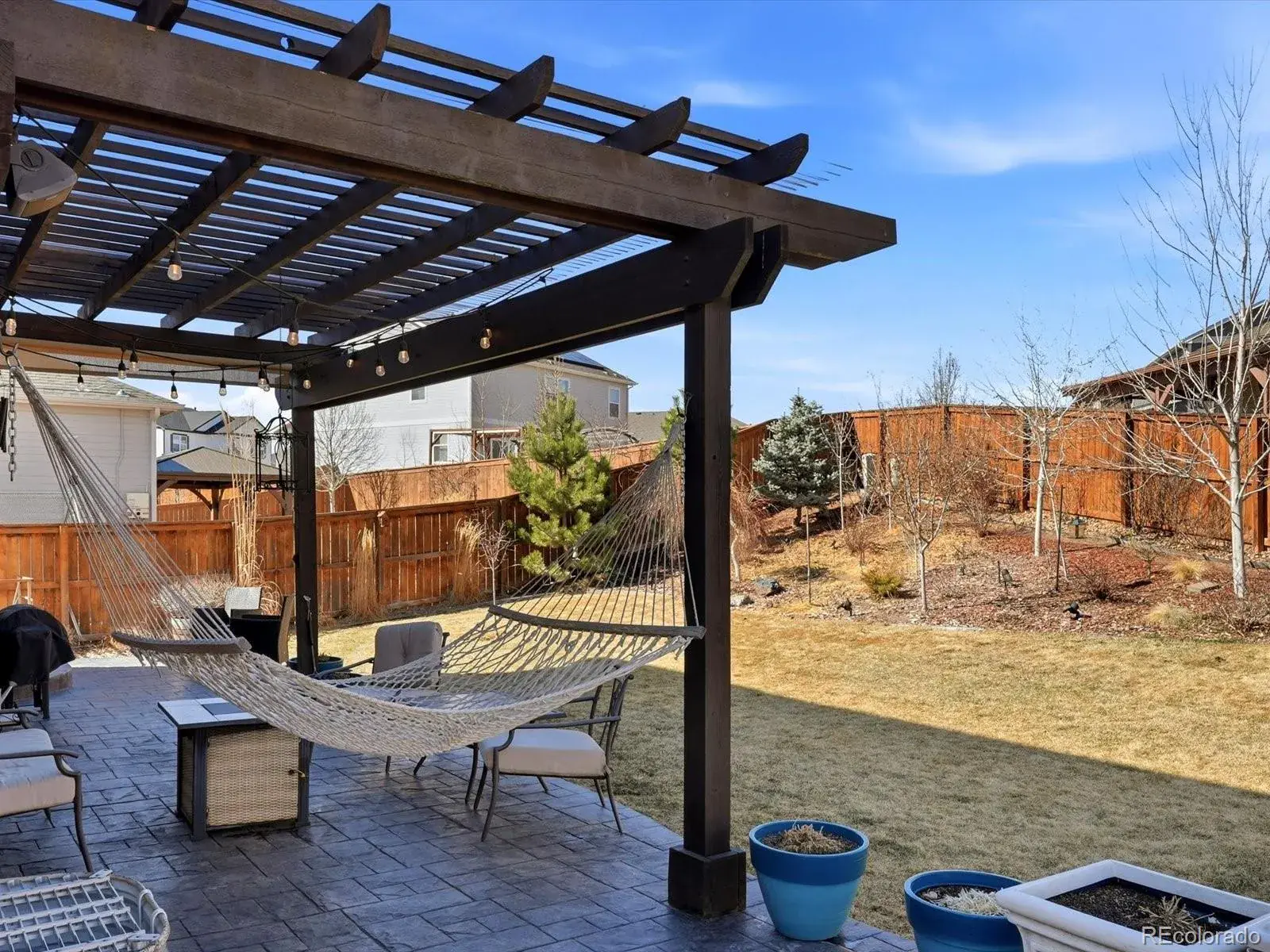 The backyard is designed for outdoor living with a large stamped concrete patio and pergola, perfect for relaxing or entertaining.