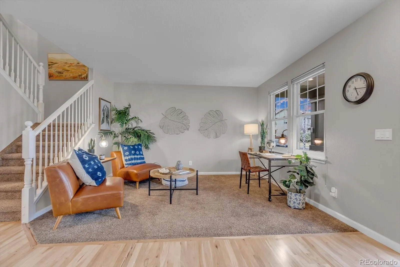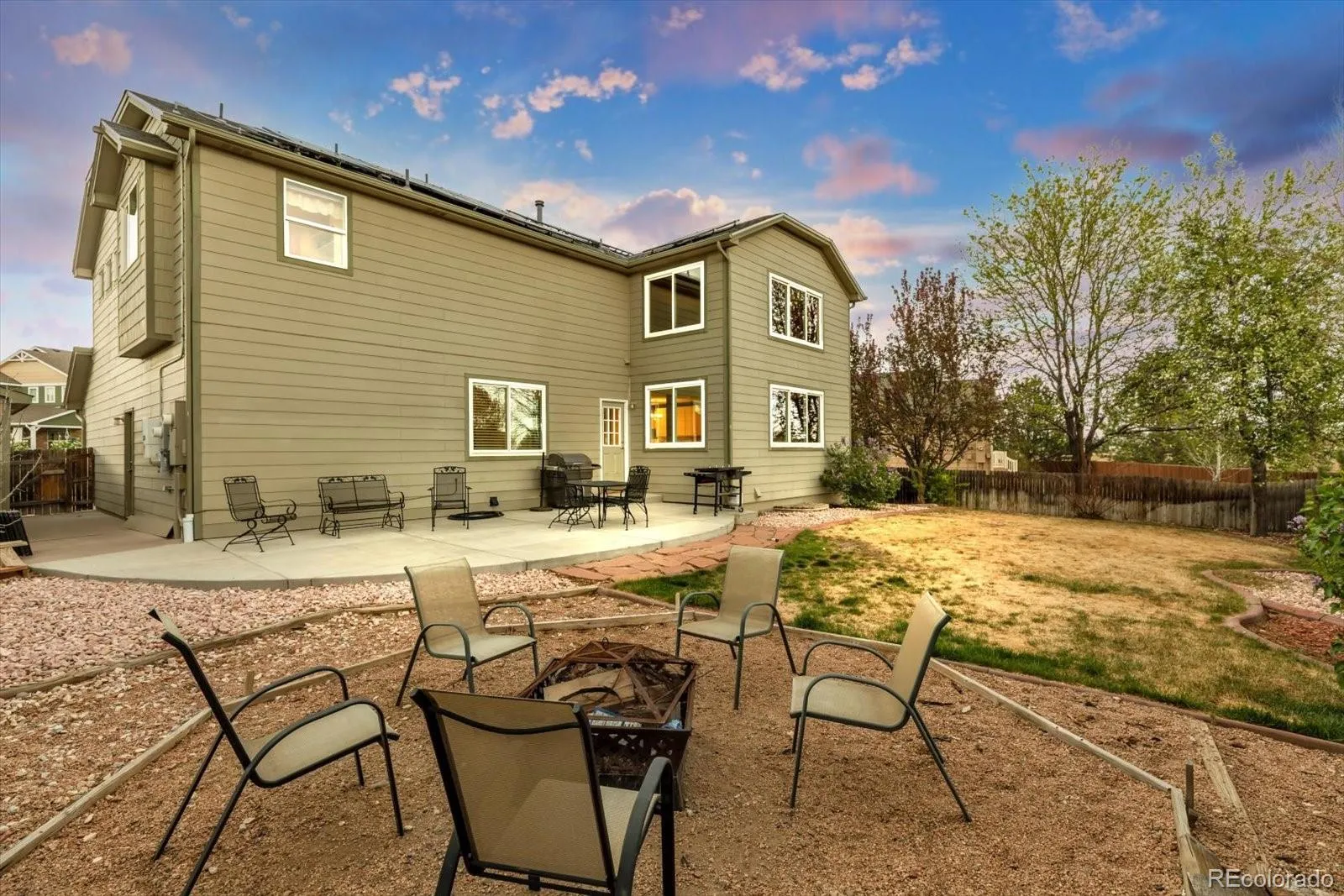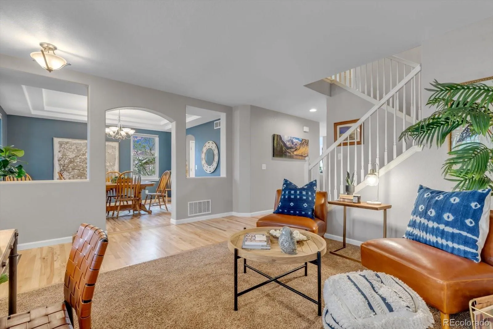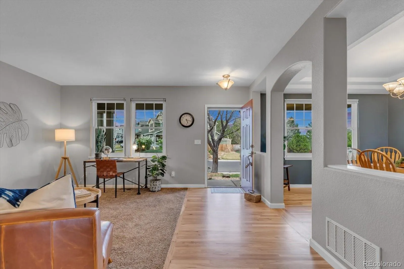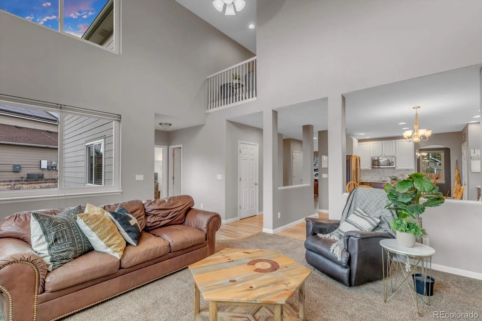 Beautiful large home in desirable Quebec Run with over 4500 square feet! Situated on a huge mature lot that backs to open space, this home has it all! Great curb appeal with new concrete driveway and paver patio for additional parking. Three-car tandem garage allows for workshop or extra storage. Newly refinished real hardwood floors greet you upon entry! Separate dining room allows for entertaining and large gatherings. Updated kitchen includes new quartz countertops, newer stainless steel appliances, updated extended cabinetry and large eat in space. Vaulted ceilings in spacious family room with fireplace and wall of windows for views to the outdoor space are the perfect hang out spot for everyone!. Sunny and bright office on main with half-bath make a great WFH option as well! Upstairs has 4 incredibly spacious bedrooms! The primary bedroom is a beautiful large retreat space with sitting area for relaxing on quiet nights. The large 5-piece primary bath and massive walk-in closet are the perfect compliments to this spa-like retreat space. The secondary full bath has been completely remodeled! Fresh paint throughout home, new roof and gutters will be installed, solar panels for lower utility bills, newer attic fan, newer lvp flooring and carpet installed upstairs. Windows replaced on main level and still under warranty! Basement is fully finished with kitchenette space, dining area, living room, bedroom and updated bathroom for possible income potential. Backyard is massive with mature trees, (two of them peach), lilac bushes and more with new concrete patio, fire pit, shed and more! Great location convenient to shopping, restaurants and downtown Denver!