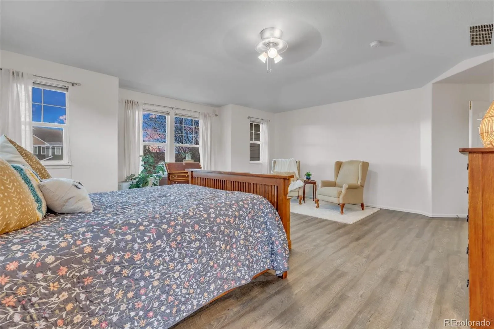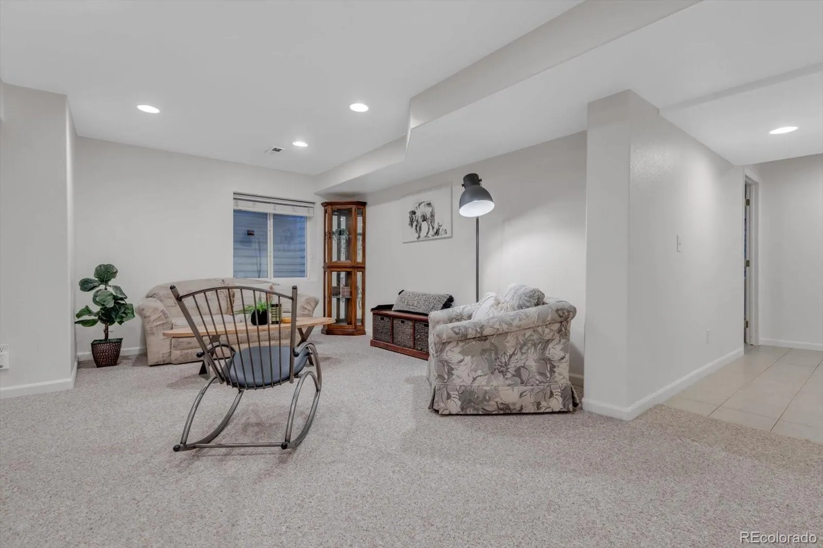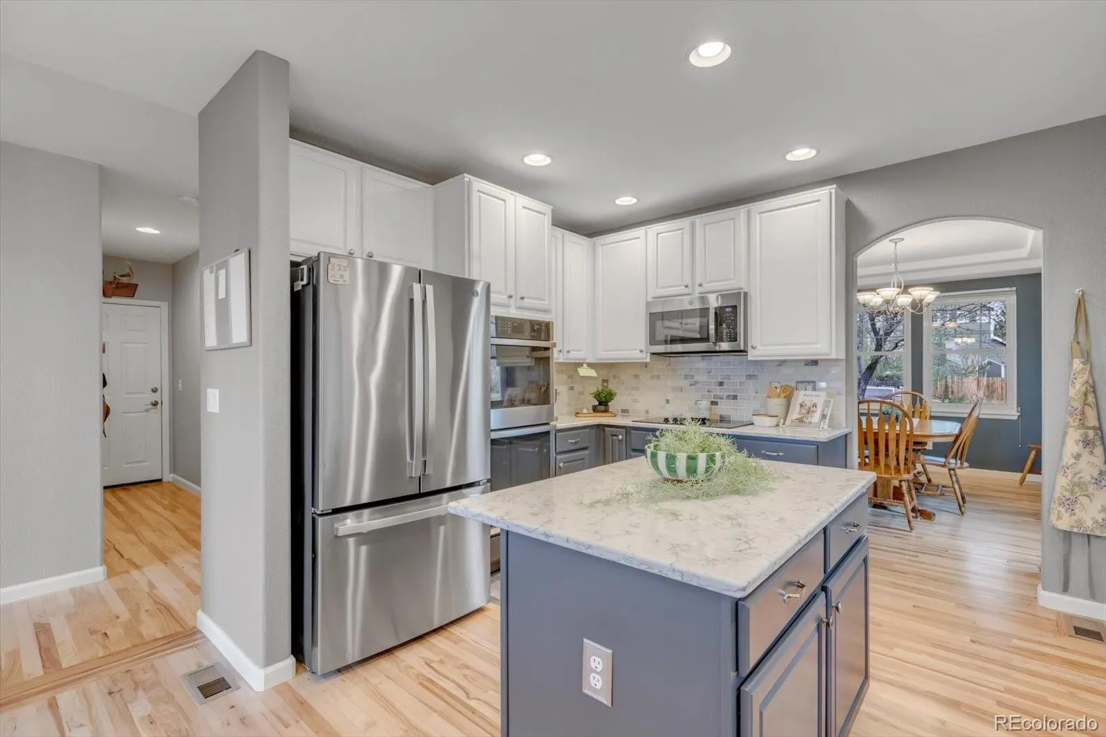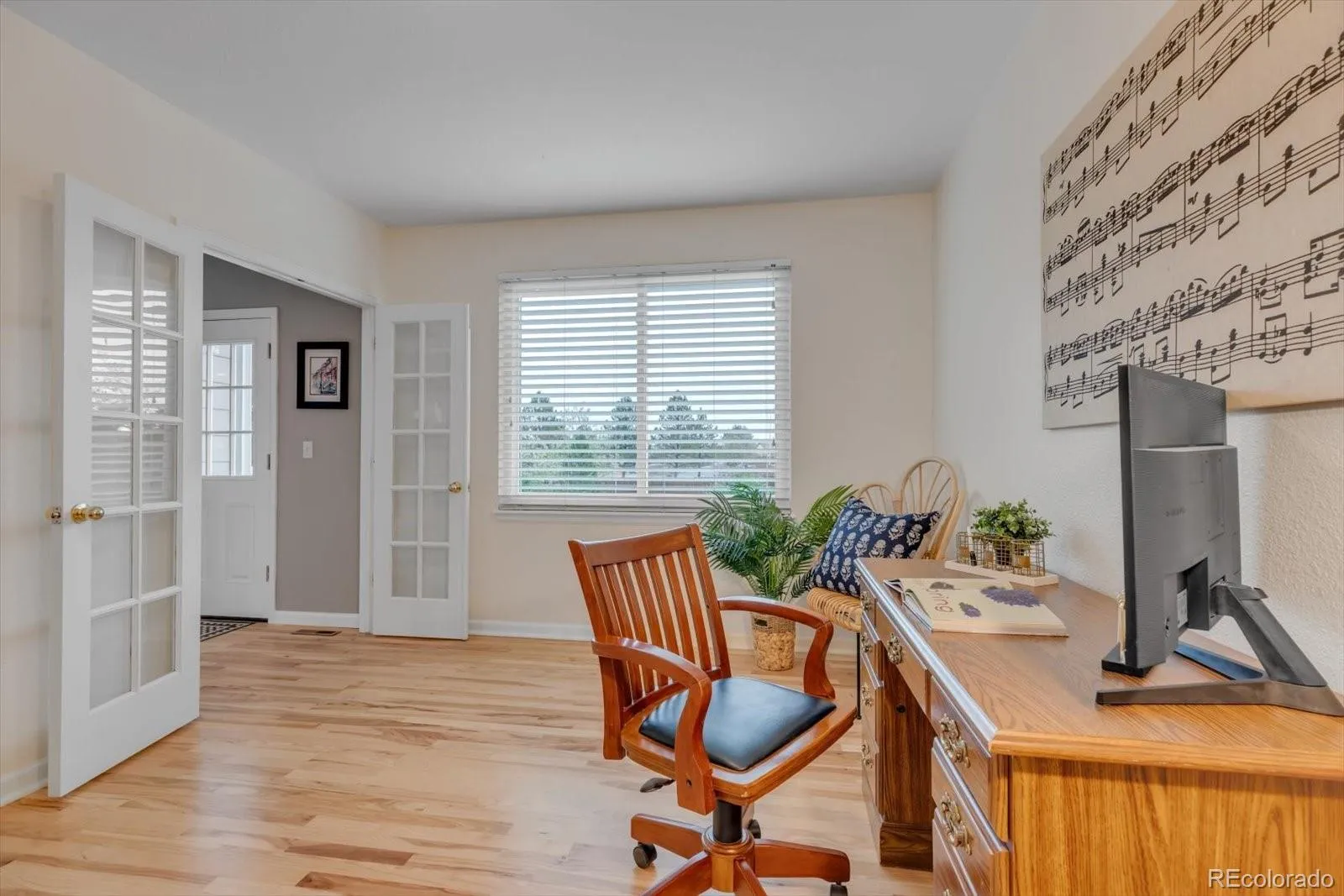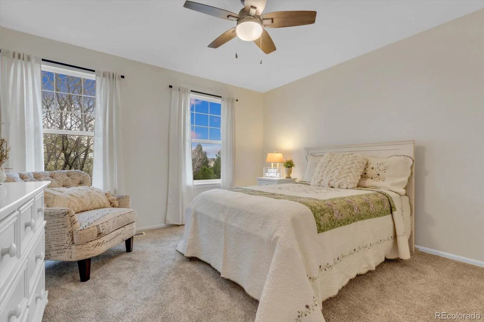 Beautiful large home in desirable Quebec Run with over 4500 square feet! Situated on a huge mature lot that backs to open space, this home has it all! Great curb appeal with new concrete driveway and paver patio for additional parking. Three-car tandem garage allows for workshop or extra storage. Newly refinished real hardwood floors greet you upon entry! Separate dining room allows for entertaining and large gatherings. Updated kitchen includes new quartz countertops, newer stainless steel appliances, updated extended cabinetry and large eat in space. Vaulted ceilings in spacious family room with fireplace and wall of windows for views to the outdoor space are the perfect hang out spot for everyone!. Sunny and bright office on main with half-bath make a great WFH option as well! Upstairs has 4 incredibly spacious bedrooms! The primary bedroom is a beautiful large retreat space with sitting area for relaxing on quiet nights. The large 5-piece primary bath and massive walk-in closet are the perfect compliments to this spa-like retreat space. The secondary full bath has been completely remodeled! Fresh paint throughout home, new roof and gutters will be installed, solar panels for lower utility bills, newer attic fan, newer lvp flooring and carpet installed upstairs. Windows replaced on main level and still under warranty! Basement is fully finished with kitchenette space, dining area, living room, bedroom and updated bathroom for possible income potential. Backyard is massive with mature trees, (two of them peach), lilac bushes and more with new concrete patio, fire pit, shed and more! Great location convenient to shopping, restaurants and downtown Denver!