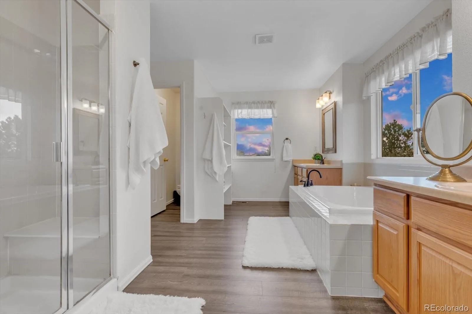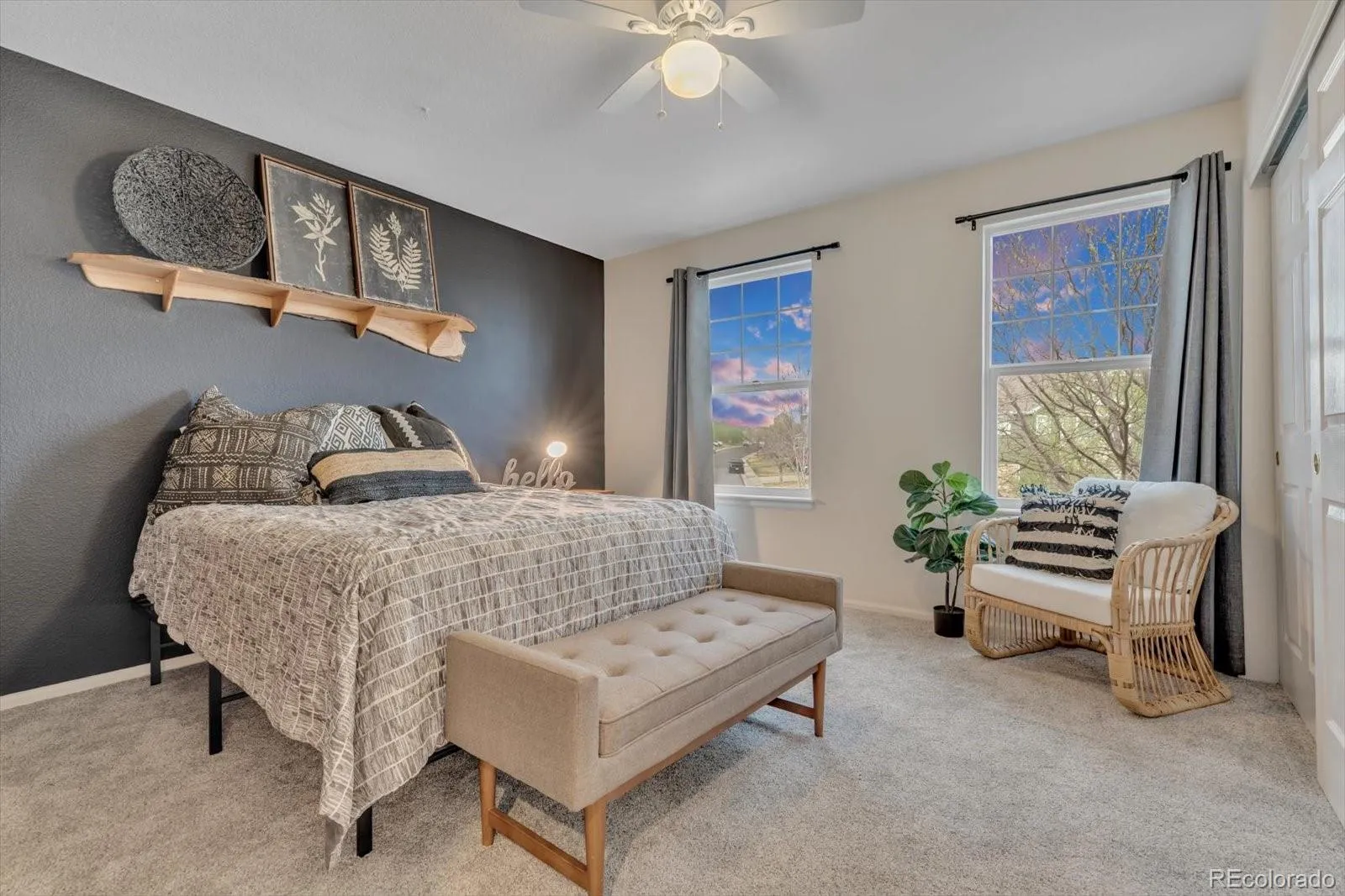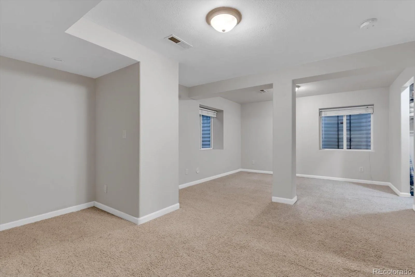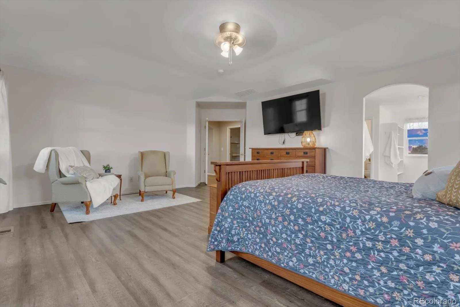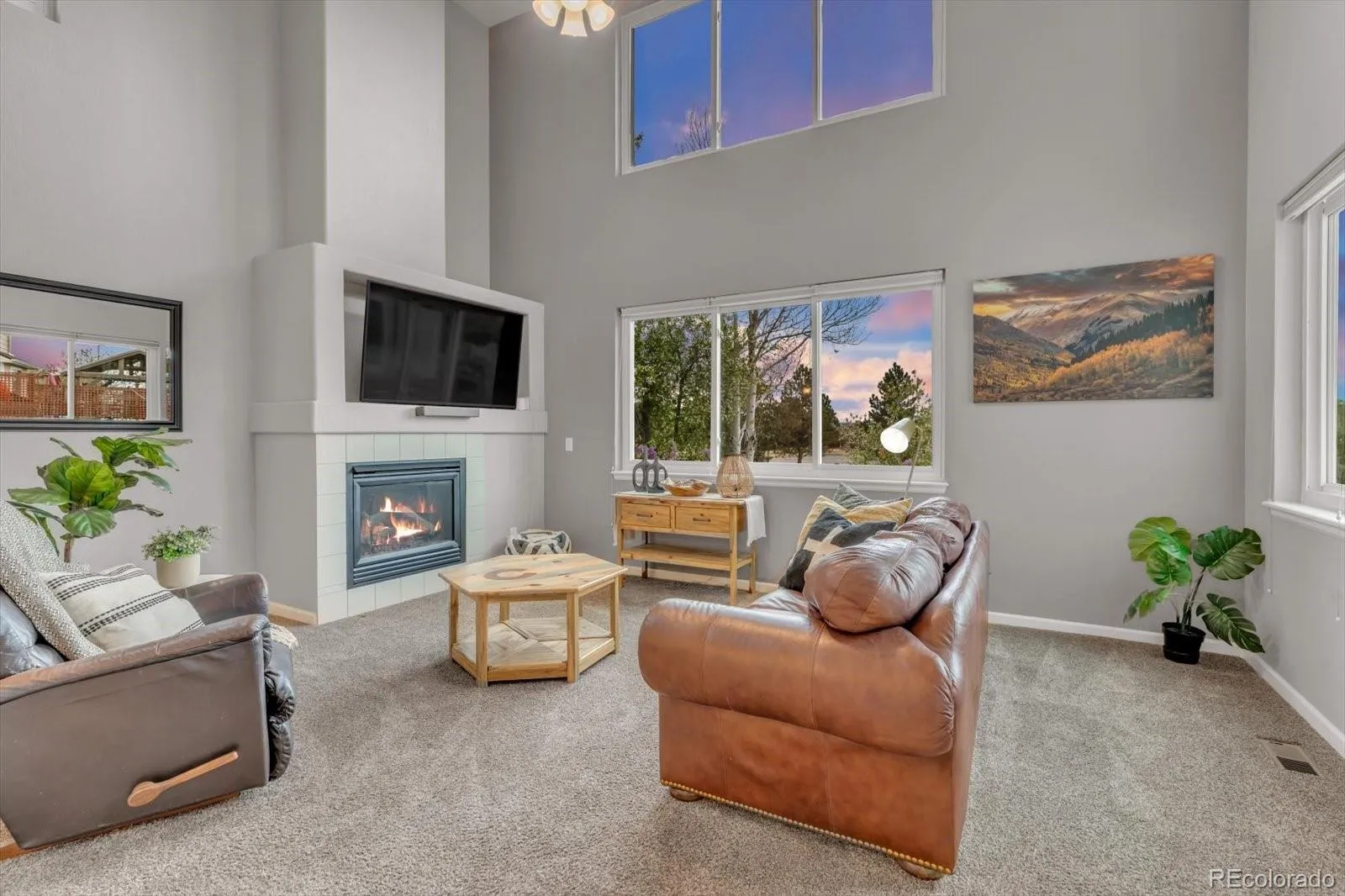 Beautiful large home in desirable Quebec Run with over 4500 square feet! Situated on a huge mature lot that backs to open space, this home has it all! Great curb appeal with new concrete driveway and paver patio for additional parking. Three-car tandem garage allows for workshop or extra storage. Newly refinished real hardwood floors greet you upon entry! Separate dining room allows for entertaining and large gatherings. Updated kitchen includes new quartz countertops, newer stainless steel appliances, updated extended cabinetry and large eat in space. Vaulted ceilings in spacious family room with fireplace and wall of windows for views to the outdoor space are the perfect hang out spot for everyone!. Sunny and bright office on main with half-bath make a great WFH option as well! Upstairs has 4 incredibly spacious bedrooms! The primary bedroom is a beautiful large retreat space with sitting area for relaxing on quiet nights. The large 5-piece primary bath and massive walk-in closet are the perfect compliments to this spa-like retreat space. The secondary full bath has been completely remodeled! Fresh paint throughout home, new roof and gutters will be installed, solar panels for lower utility bills, newer attic fan, newer lvp flooring and carpet installed upstairs. Windows replaced on main level and still under warranty! Basement is fully finished with kitchenette space, dining area, living room, bedroom and updated bathroom for possible income potential. Backyard is massive with mature trees, (two of them peach), lilac bushes and more with new concrete patio, fire pit, shed and more! Great location convenient to shopping, restaurants and downtown Denver!