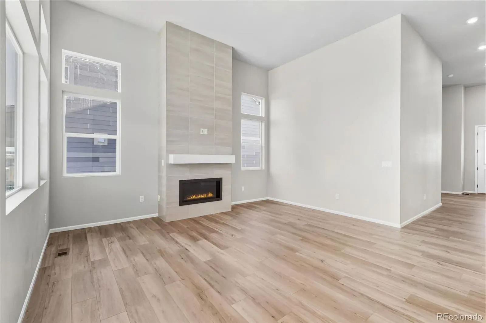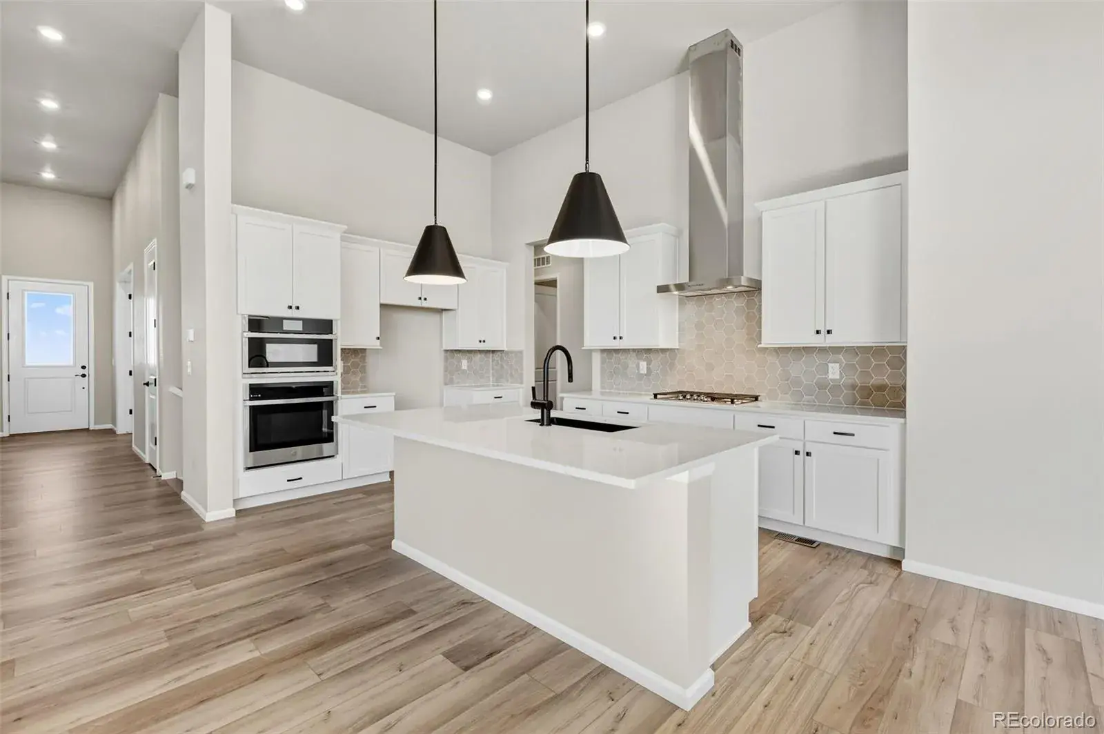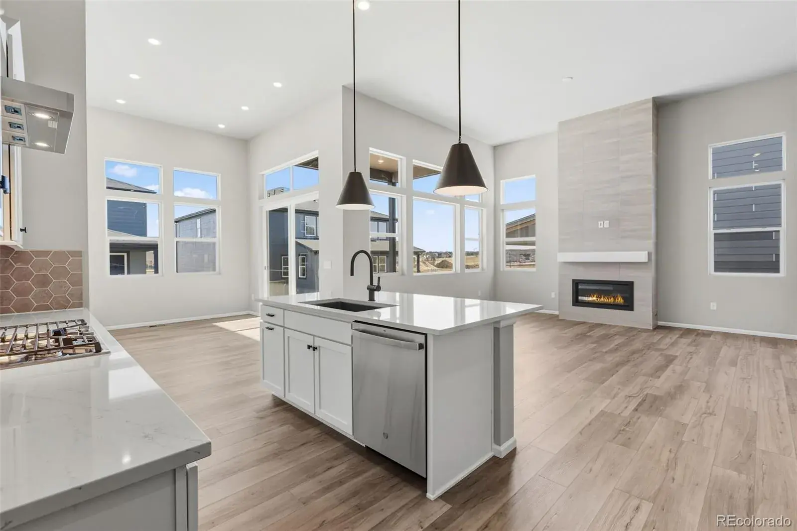 The great room is anchored by a cozy fireplace and flows seamlessly into the chef’s kitchen, which showcases white cabinetry, quartz countertops, stylish backsplash, and stainless steel appliances including a gas cooktop with hood, built-in microwave and oven, and dishwasher.