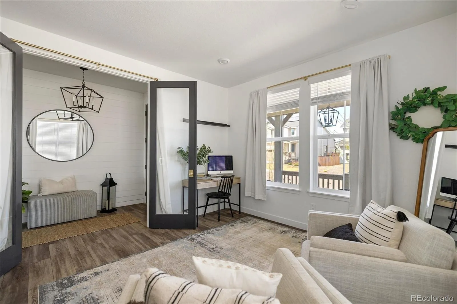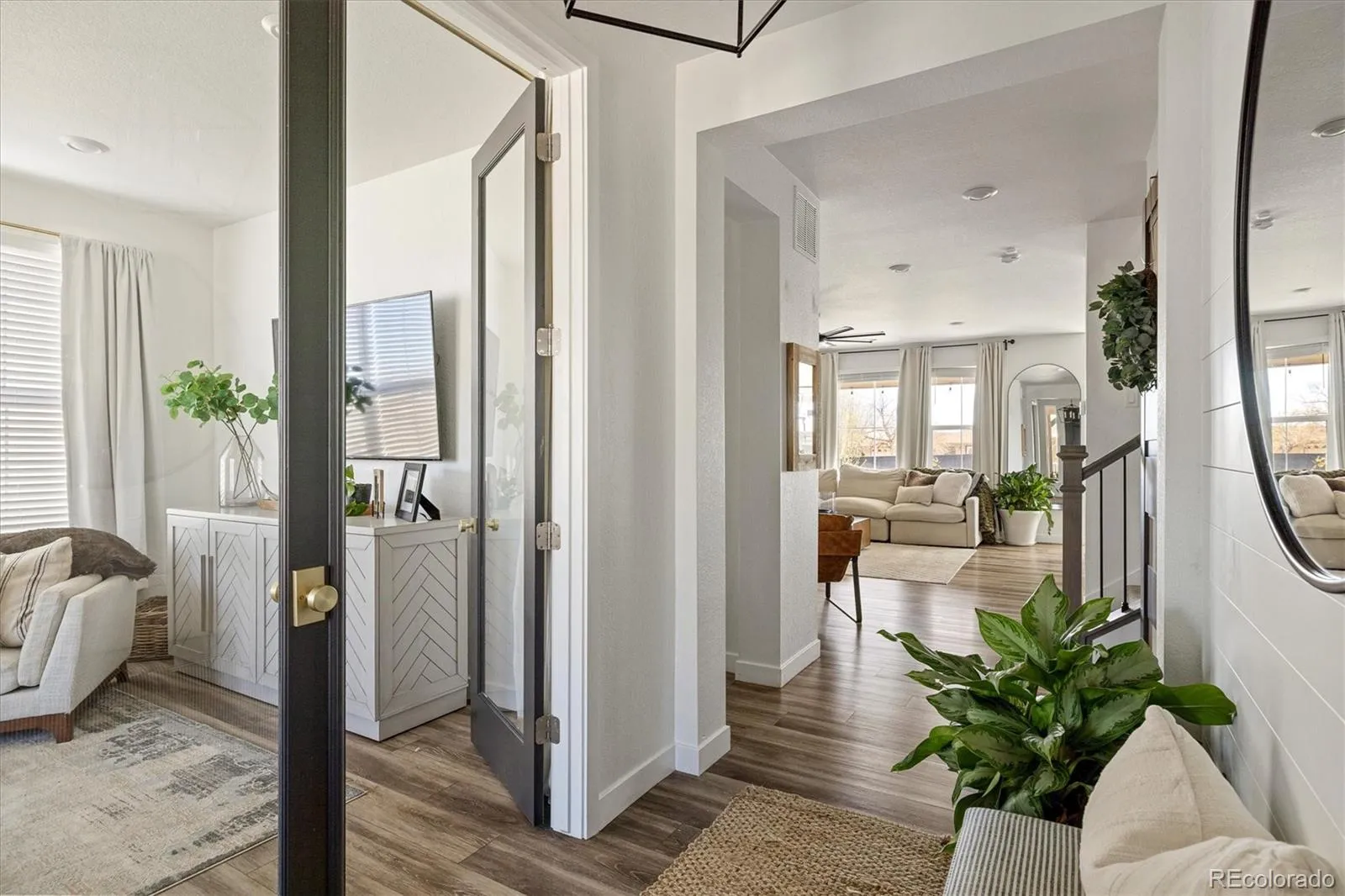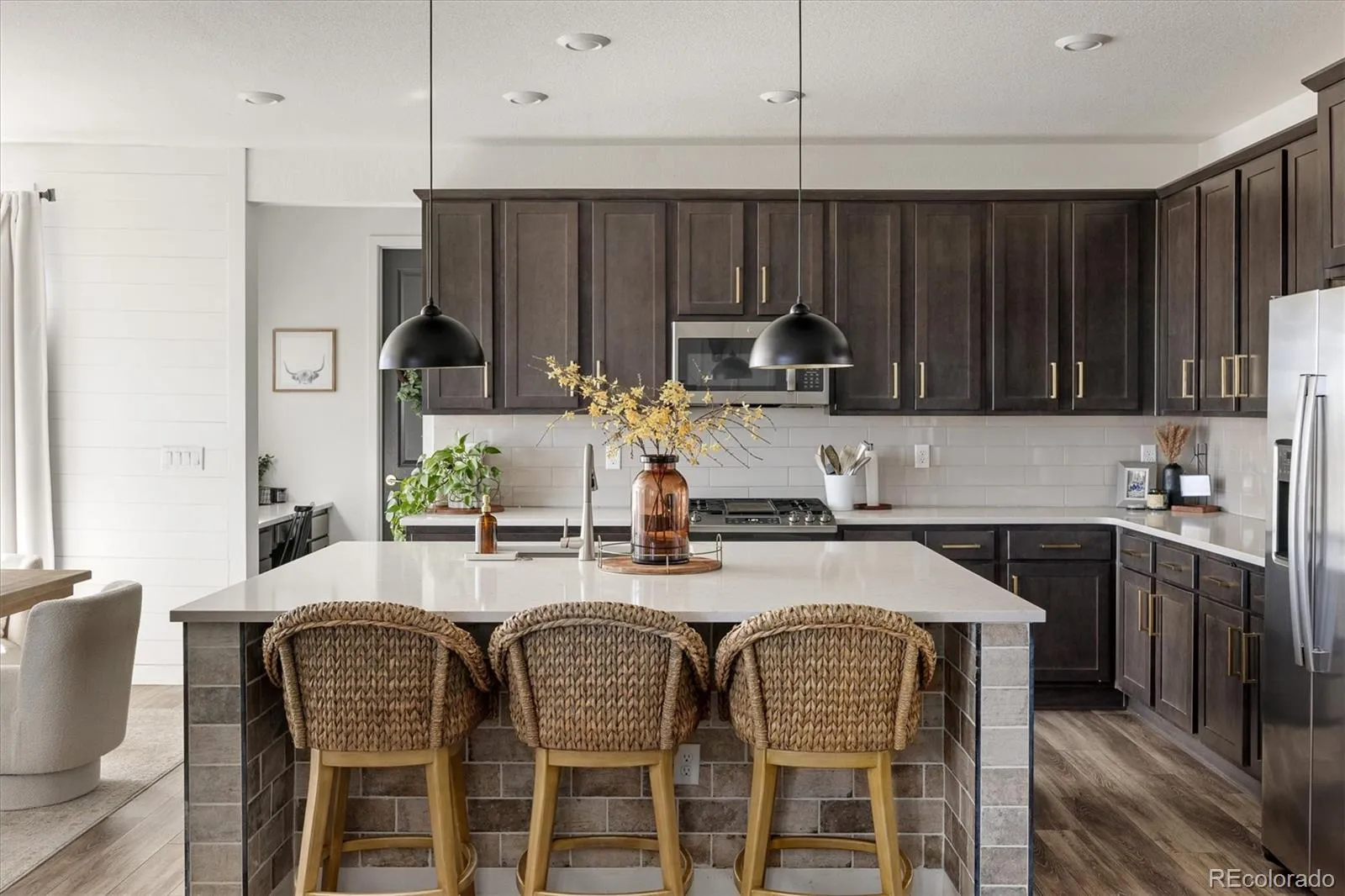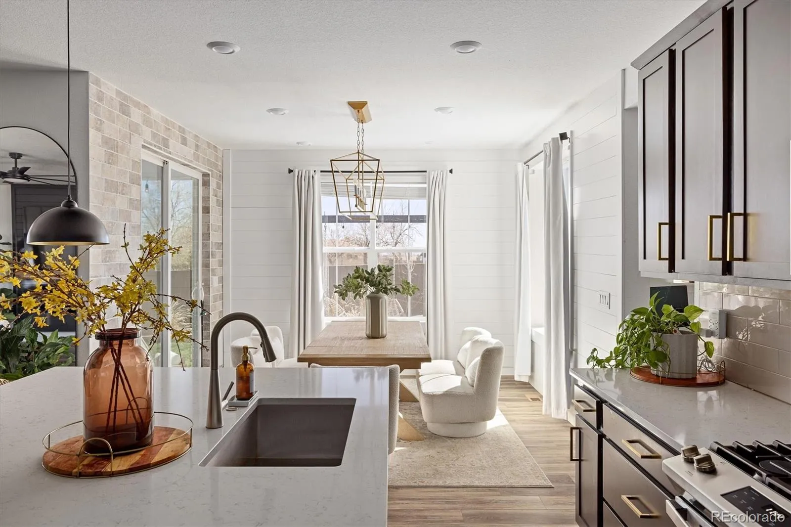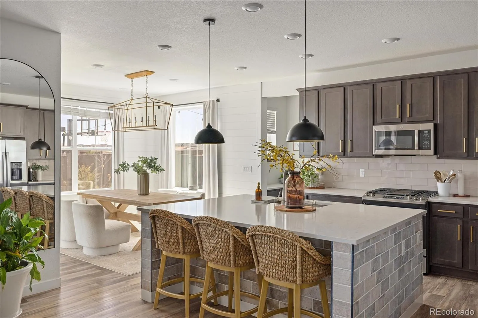 The main level is designed for both style and function, featuring a spacious office/bedroom/flex space with custom glass doors, a striking powder room with octagonal tile walls & custom cabinetry with designer hardware. Relax in the great room, complete w/ a modern fireplace and mantle, shiplap walls & large windows for plenty of natural light. The kitchen is a chef’s dream w/ elegant cabinetry, gas range, gold hardware, quartz countertops, designer island, custom lighting, stainless appliances, large pantry, office nook & convenient mudroom space. The dining room is highlighted by a gorgeous tiled accent wall & sunlight pouring in on all sides.