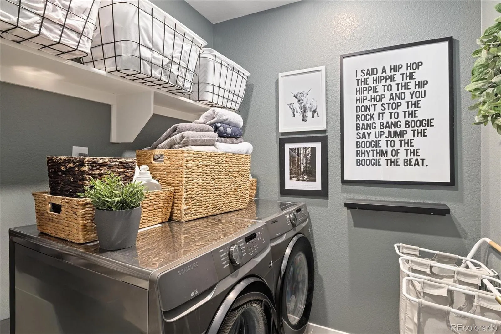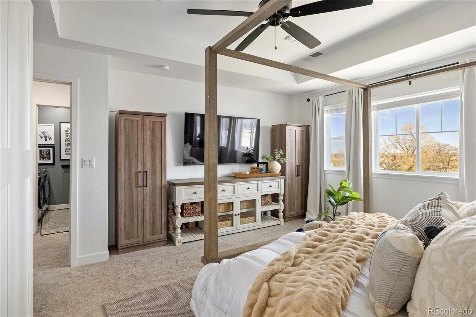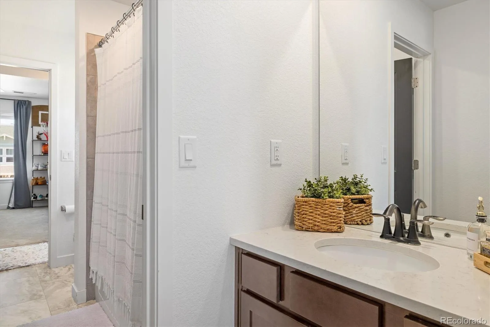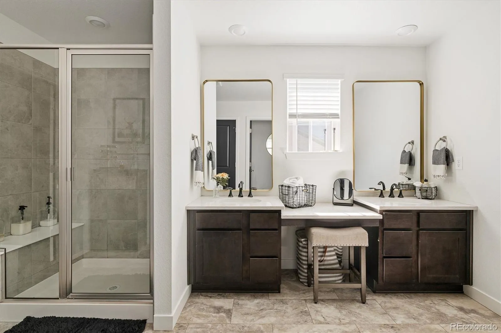 Upstairs, the layout is equally appealing! The laundry room, 2 spacious bedrooms connected by a Jack and Jill bathroom & large loft/potential bedroom w/ its own full bath make this home very versatile. The primary retreat is pure luxury—featuring a stunning accent wall, a huge walk-in closet, built-in armoire, spa-like bathroom w/ dual vanities, framed mirrors, extra counter space & large shower w/ bench.