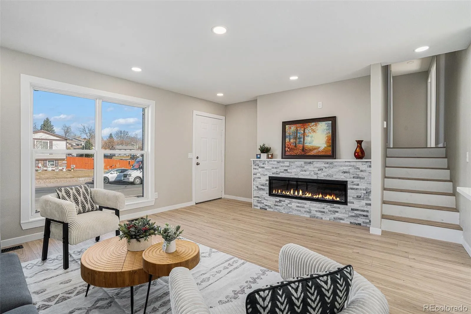 The inviting living room features a sleek electric fireplace as a stylish focal point, ideal for relaxing or entertaining. The fully remodeled kitchen impresses with white shaker cabinetry, elegant quartz countertops, a modern tile backsplash, and new stainless steel appliances—perfect for everyday meals and gatherings.