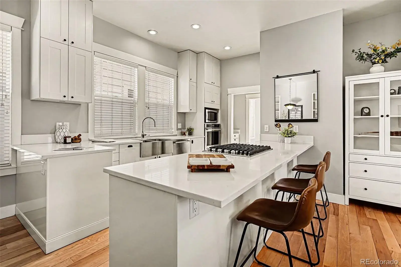 Situated on a premium corner lot near open space, walking trails, and parks, this home combines location, lifestyle, and versatility. A classic wraparound porch welcomes you into a light-filled open floor plan designed for both everyday living and entertaining. Freshly painted exterior and refinished hickory hardwood floors carry throughout the main level, leading to a beautifully updated kitchen with 42” cabinetry, quartz countertops, a spacious butler’s pantry, and seamless connection to the family room.