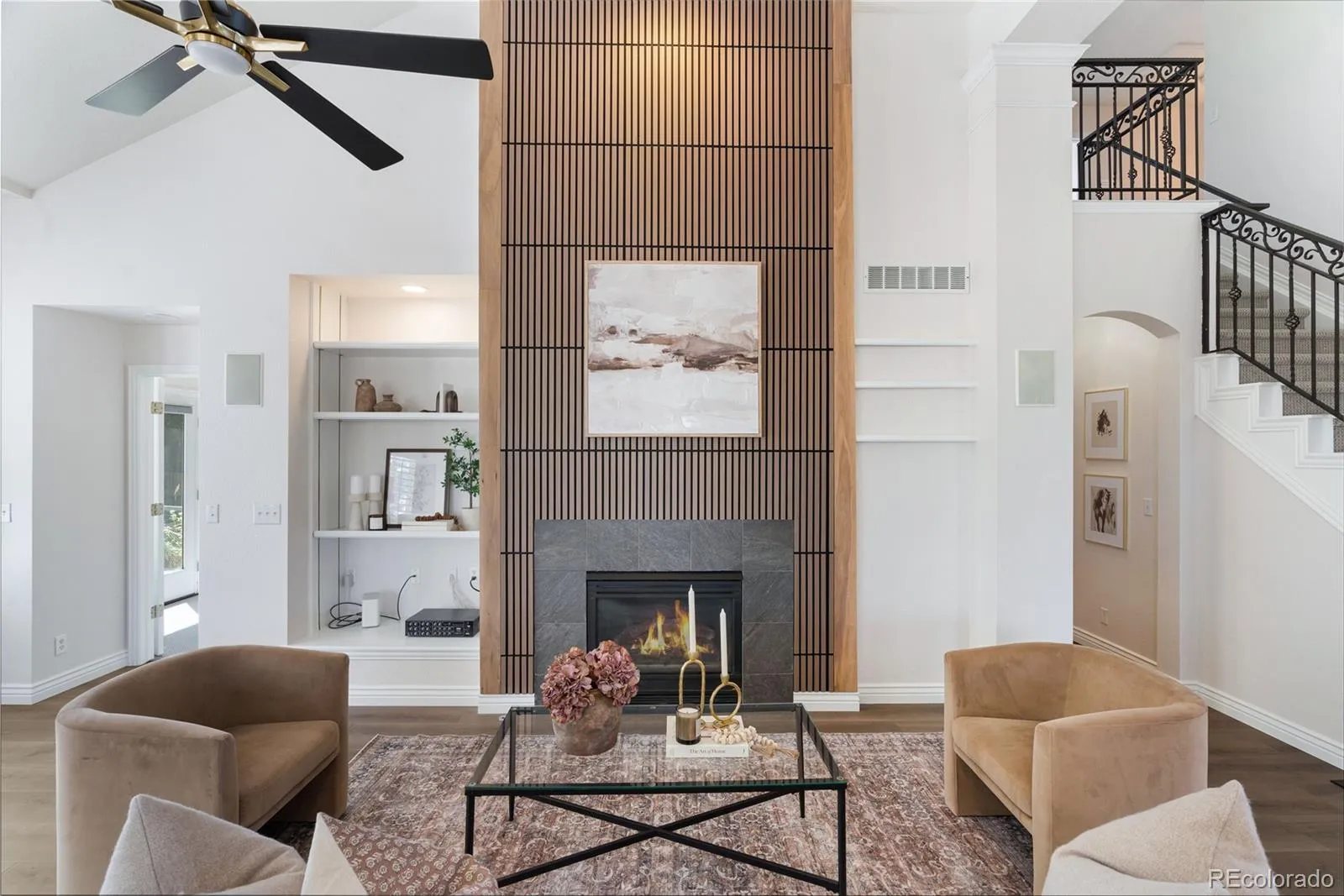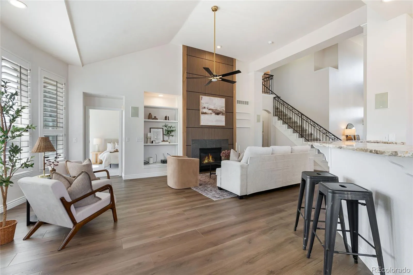 Inside, thoughtful updates create a fresh, comfortable feel, including new paint, plush carpet, updated lighting, and stylish fixtures throughout. The previous tile flooring has been upgraded throughout the main living areas and bathrooms to high-grade luxury vinyl plank, adding durability and a striking, cohesive look. The open-concept living area is anchored by a newly designed fireplace wall, while large windows fill the home with natural light and showcase the surrounding greenery. The main-floor primary suite offers comfort and convenience, with French doors opening to the patio and large windows framing the backyard. A dedicated office features practical built-in shelving, cabinets, and beautiful mountain views.