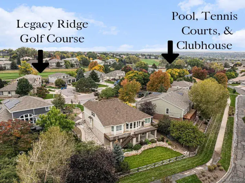 Welcome to this beautifully updated 2-story home in the highly sought-after Legacy Ridge community. As you step inside, you’re welcomed by a bright, expansive floor plan that seamlessly connects the living, dining, and kitchen areas—perfectly designed for both everyday living and entertaining. The vaulted ceilings, gas fireplace, and an abundance of natural light in the living room create a warm, open feel. The kitchen is a chefs dream featuring stainless steel appliances, natural gas cooktop, reclaimed wood bar top, a breakfast nook, and easy flow into both the main living spaces and a dedicated dining area, ideal for hosting gatherings. A large main floor office provides the perfect work-from-home space. The main floor primary suite is a private retreat, featuring a spacious bedroom, an updated luxurious 5-piece bath with dual vanities, soaking tub, walk-in shower, and a separate water closet, along with an oversized walk-in closet for ample storage. Upstairs, you’ll find 3 generously sized secondary bedrooms with plenty of natural light and closet space, and an updated full bath. Enjoy mountain views and the convenience of being right next to Legacy Ridge Golf Course, with HOA amenities including a pool, clubhouse, trails, and tennis courts just steps from the front door. Updates include newer windows throughout most of the home, a newer roof, and a brand-new water heater. The finished walk out basement expands your living space with a large rec room, wet bar area, and additional storage—perfect for game nights, a home theater, or fitness setup. This move-in ready home combines thoughtful updates, community amenities, and an unbeatable location in one of the area’s most desirable neighborhoods.
