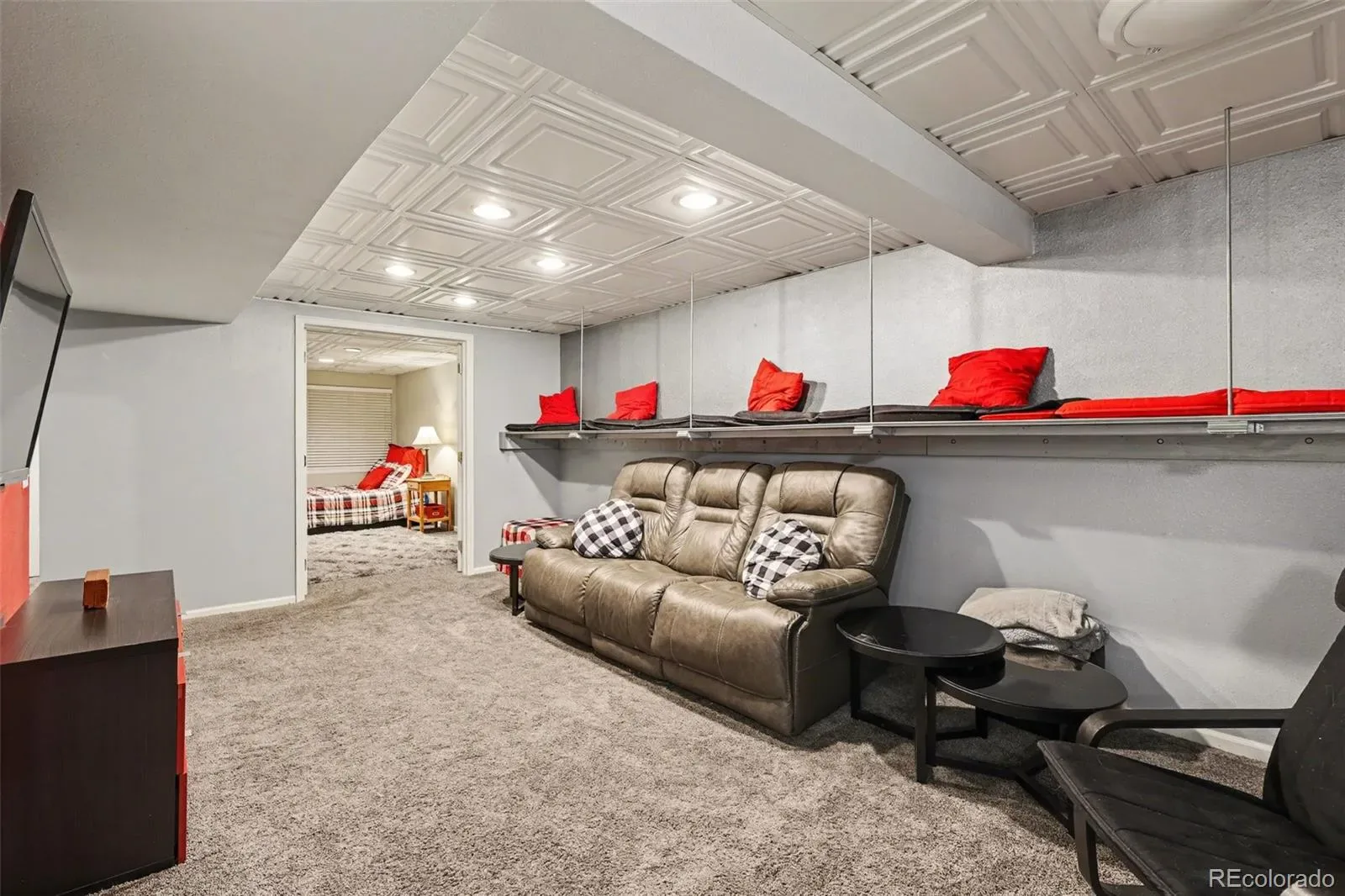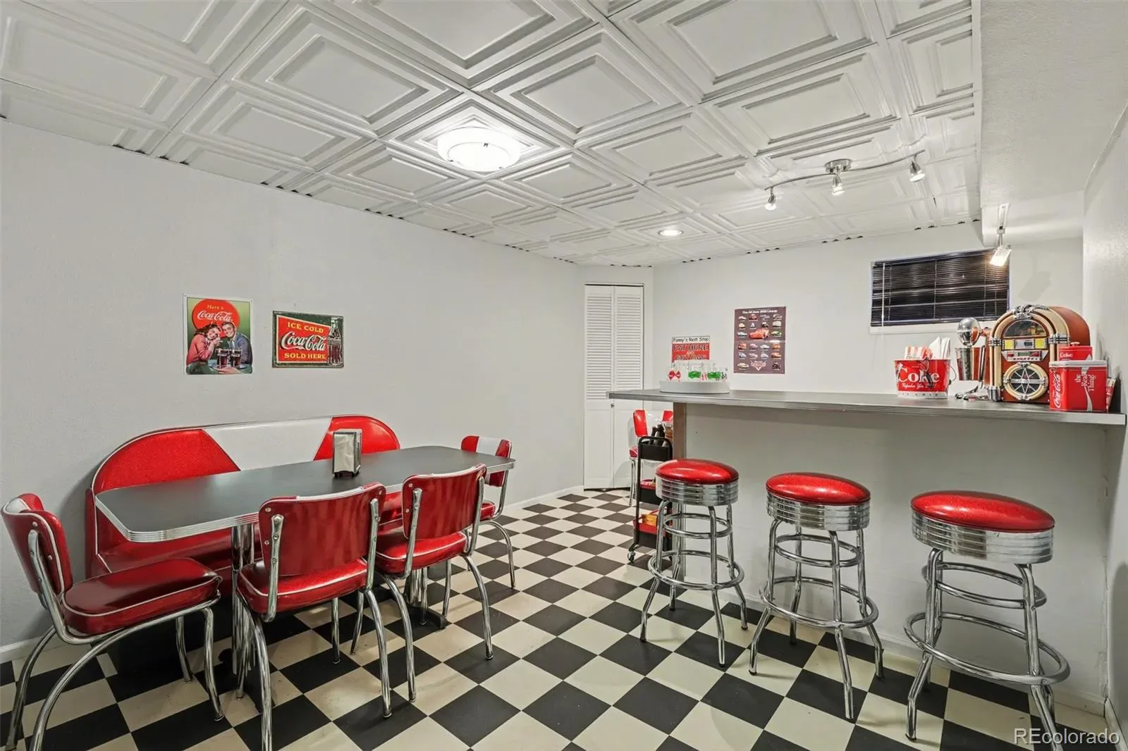 The fully finished basement delivers a truly memorable 1950’s diner-themed gathering space; perfect for movie nights, game nights, or hosting friends. This media room is complete with full wet bar, refrigerator, and a custom floating lounge bench. All 50s furniture and mounted TV included in sale. The basement also features a separate bedroom, full bathroom + laundry room.