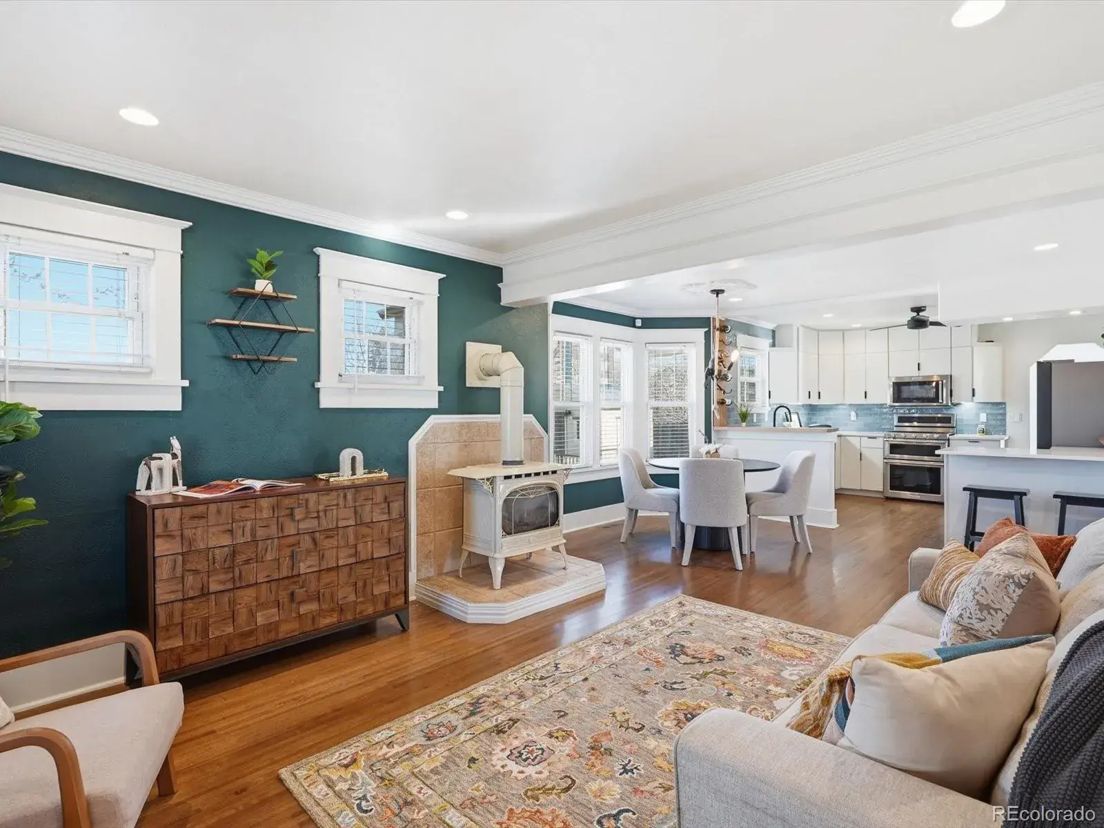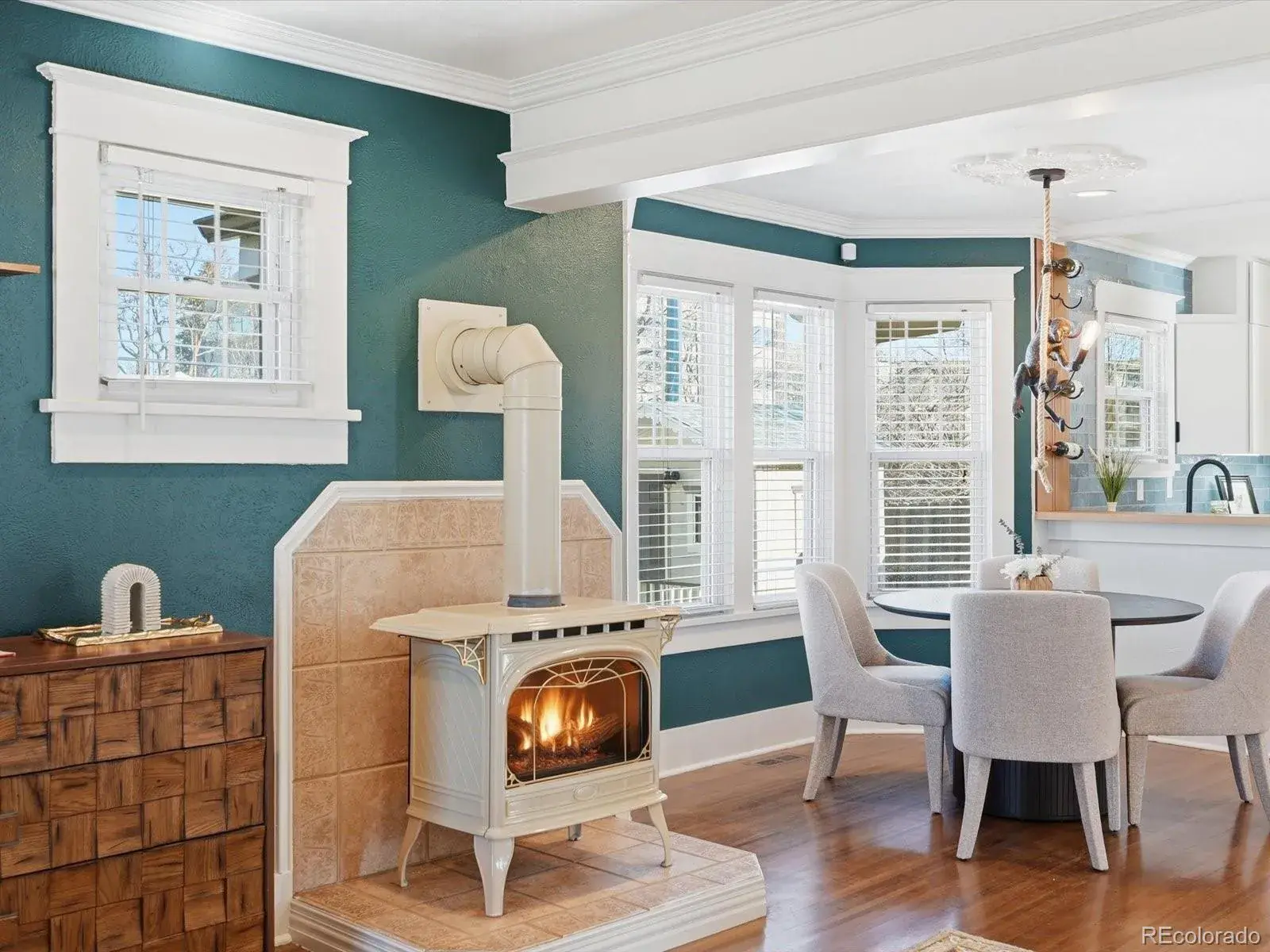 Charming curb appeal and the added convenience of two driveways set the tone. Inside, natural light pours through bay windows and sun-wrapped spaces, highlighting hardwood floors, crown molding, arched openings that honor the home’s original craftsmanship. The open living, dining, and kitchen layout feels bright, effortless, and inviting — perfect for entertaining friends or cozy nights in. A cast iron gas stove anchors the living space with warmth and charm.