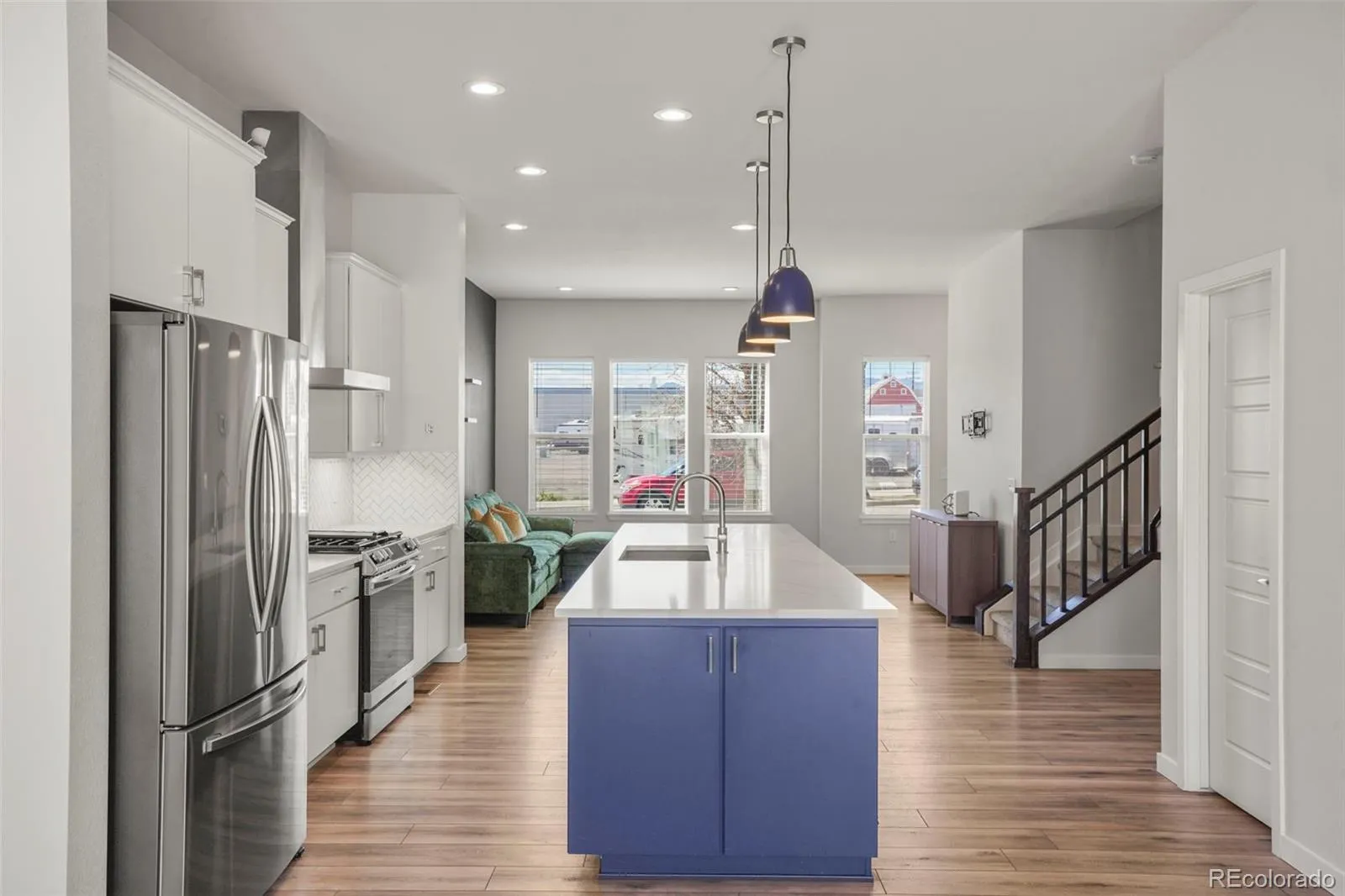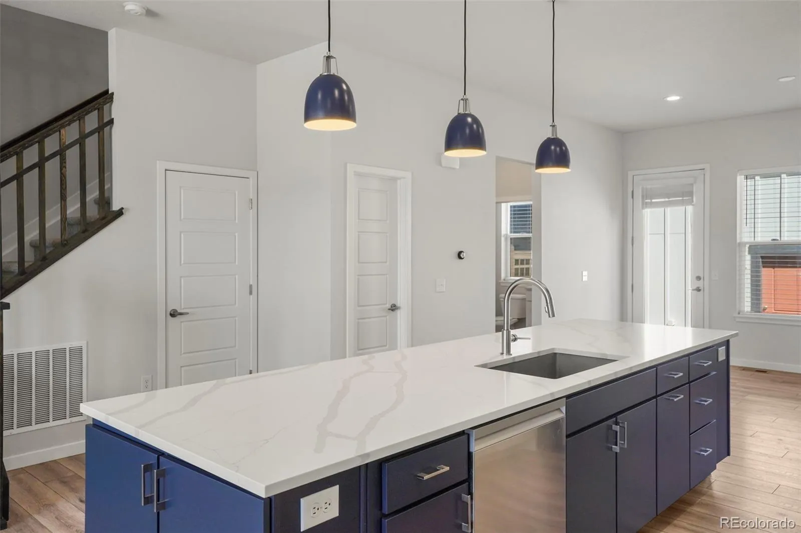 The main level features an open-concept floor plan with high ceilings, abundant natural light, and seamless flow between the living, dining, and kitchen spaces—perfect for everyday living and entertaining. The kitchen is thoughtfully appointed with quartz countertops, a large center island, pantry, eat-in dining space, and stainless steel appliances. Fresh interior paint and newly replaced carpet enhance the home’s clean, move-in-ready appeal.