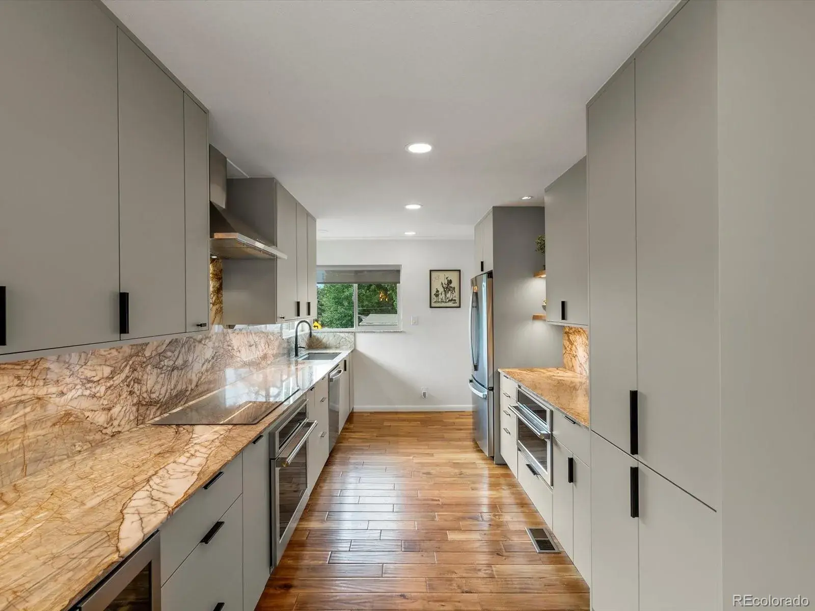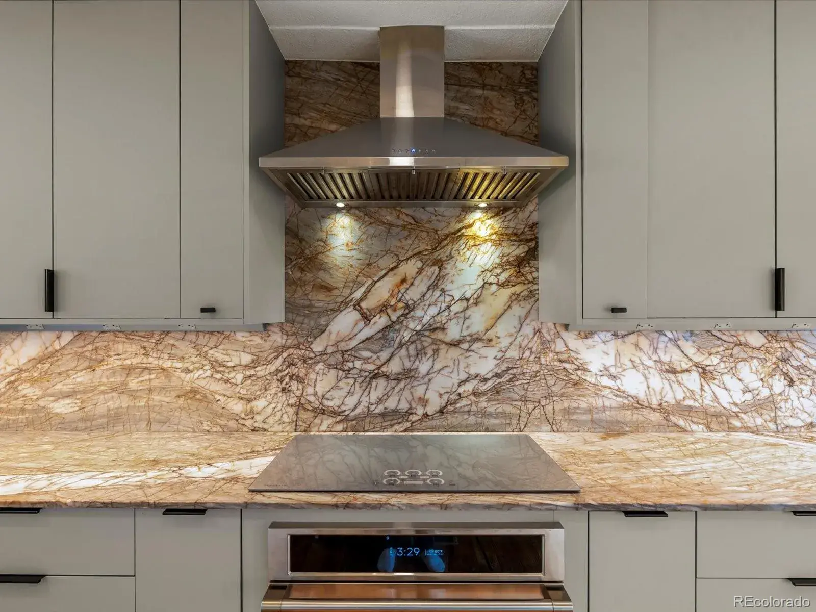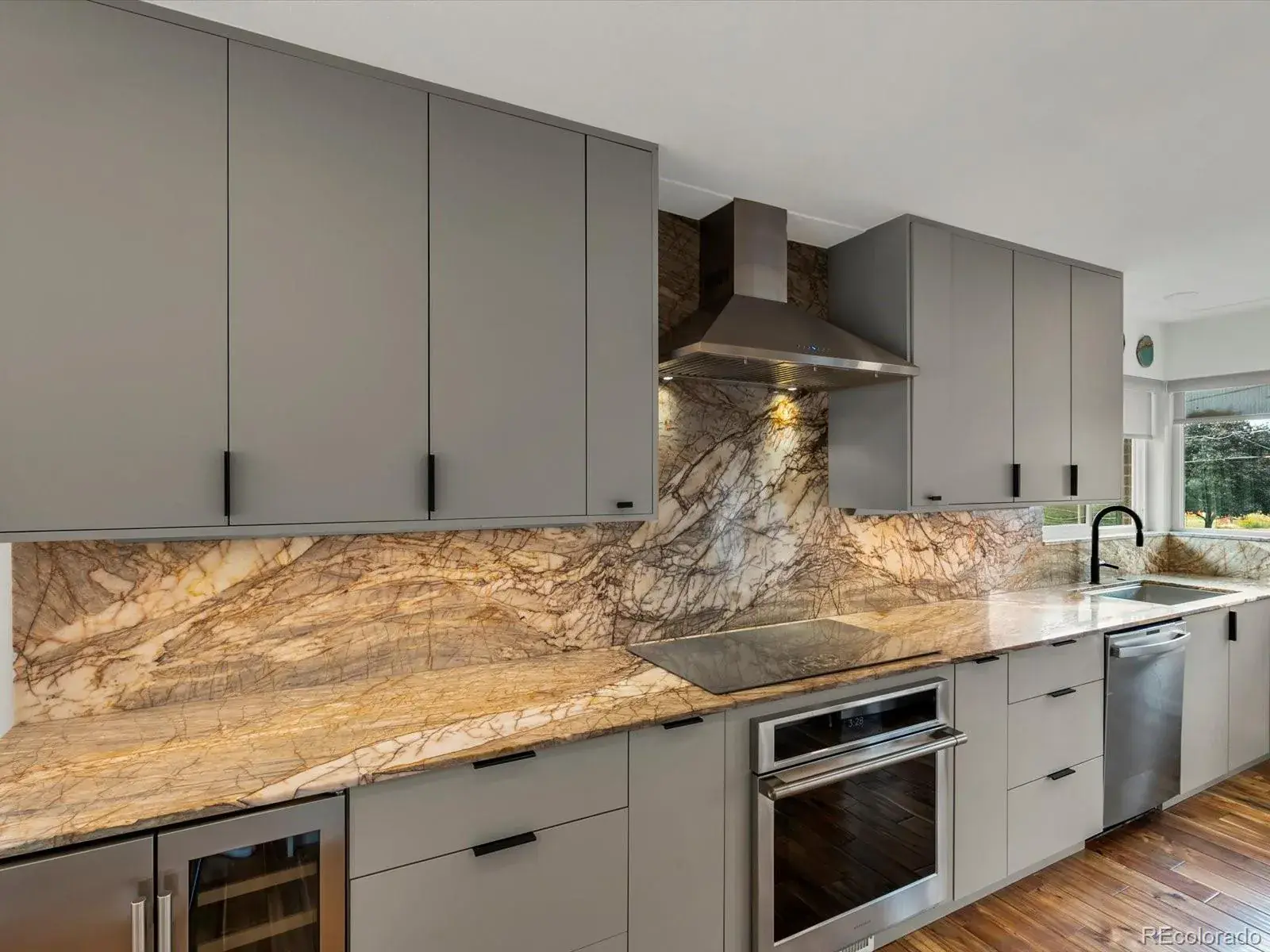 The kitchen is the heart of the home and it shows. Blue Dragon countertops command attention in the best way, paired with a Monogram speed oven, induction cooktop, and soft dimmable under-cabinet lighting that elevates everyday moments. Even meal prep feels different when your kitchen window frames Mount Blue Sky in the distance.