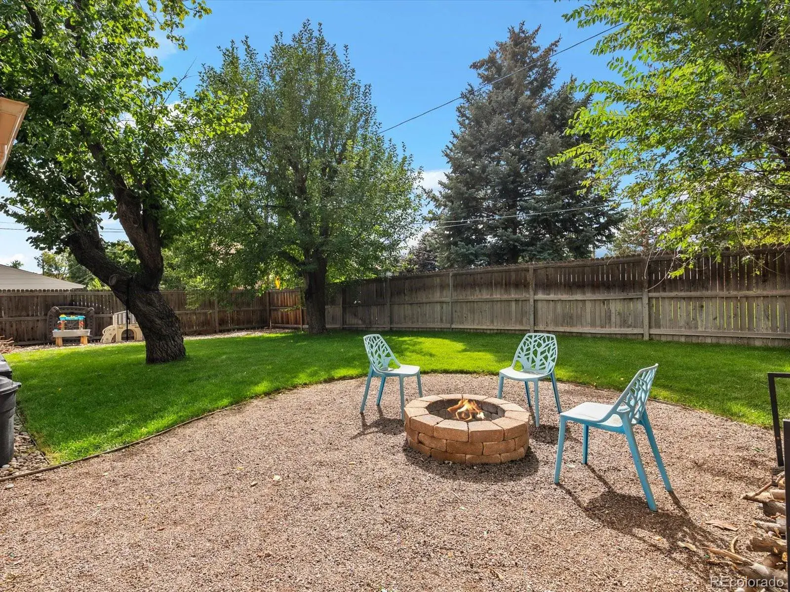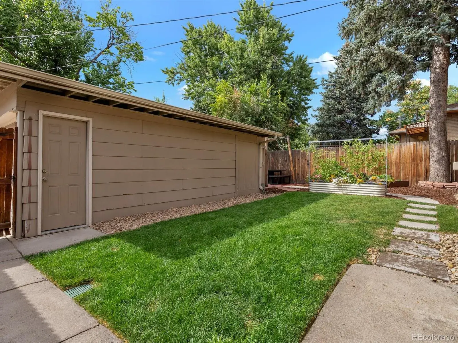 Out back, the yard lives like an extension of the home. One side offers a lush, sprinkler-fed lawn and firepit for Colorado evenings. The other side is a thoughtfully designed garden with drip irrigation and stepping stones for easy care. A covered seating area anchors the space — perfect for dinner parties, morning coffee, or quiet nights under the lights.